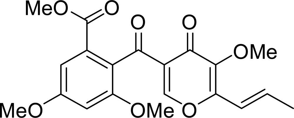 1H- and 13C-NMR were recorded on a Bruker DRX400 instrument. Chemical shifts are reported in δ, parts per million (ppm), relative to TMS as an internal standard. Mass spectra were obtained on an API QSTAR Pulsar i spectrometer. The molecular formula of compound 1 was determined to be C20H20O8 by the high resolution mass spectrum. From the 1H- and 13C-NMR spectral data, compound 1 was identified as 3-O-methylfunicone (Figure 1). These spectroscopic data were consistent with those previously reported [23]. The analyzed data of compound 1 are shown below: 3-O-Methylfunicone (1). Colorless amorphous solid; 1H-NMR (CDCl3) δ: 8.49 (1H, d, J = 0.4 Hz), 7.09 (1H, d, J = 2.4 Hz), 6.64 (1H, d, J = 2.4 Hz), 6.61 (1H, dq, J =16.0, 6.4 Hz), 6.54 (1H, ddd, J = 16.0, 1.2, 0.4 Hz), 3.86 (3H, s), 3.81 (3H, s), 3.78 (3H s), 3.73 (3H, s), 1.97 (3H, dd, J = 6.4, 1.2 Hz); 13C-NMR (CDCl3) δC: 191.8, 172.4, 166.4, 160.7, 159.1, 157.3, 154.6, 144.1, 134.9, 129.7, 126.3, 126.1, 118.4, 105.2, 102.9, 60.5, 56.0, 55.5, 52.3, 18.9; HR ESIMS m/z 411.1058 [M+Na]+ (calcd for 411.1055).
