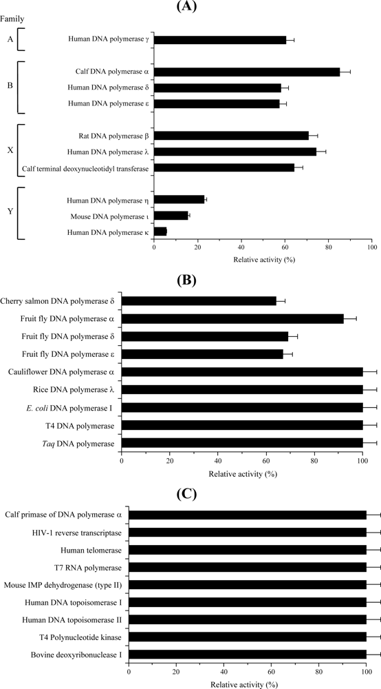Effect of 3-O-methylfunicone (1) on the activities of various DNA polymerases and other DNA metabolic enzymes. (A) Mammalian pols, (B) fish, insect, plant and prokaryotic pols, and (C) other DNA metabolic enzymes. Compound 1 (100 μM) was incubated with each enzyme (0.05 units). % of relative activity. Enzymatic activities were measured as described in the Experimental section. Activities in the absence of the compounds were taken as 100%. Data are shown as the means ± SEM of four independent experiments.
