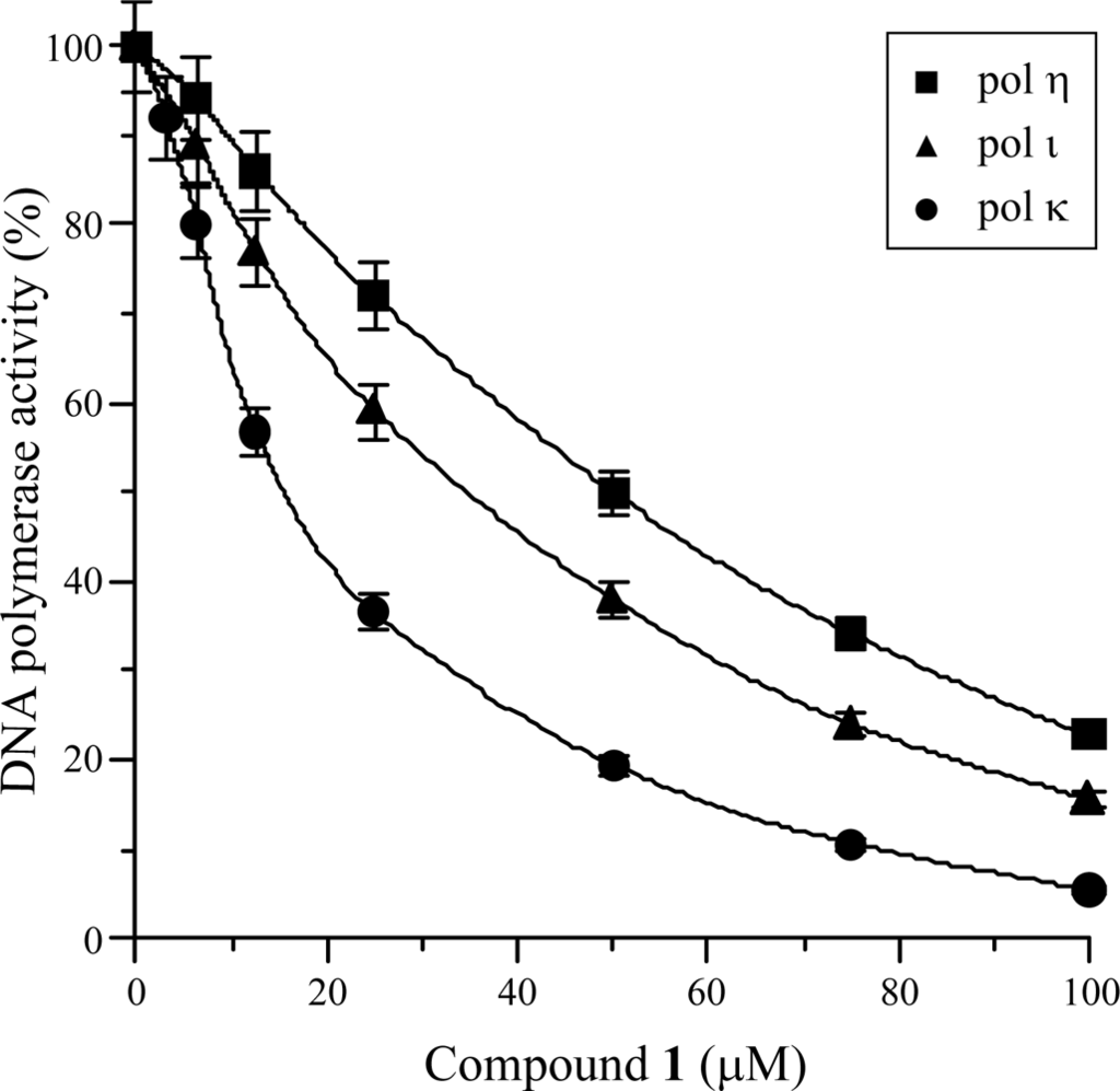 First, the isolated compound 1 was investigated as to whether it inhibited the activities of ten mammalian pols, such as families A (pol γ), B (pols α, δ and ɛ), X (pols β and λ and TdT), and Y (pols η, ι and κ). As shown in Figure 2A, this compound at 100 μM was found to selectively inhibit the activity of the Y-family of pols, and within this family pol κ was the most sensitive. Compound 1 inhibited the activities of these pols dose-dependently, and 50% inhibition of pols η, ι and κ was observed at concentrations of 50.1, 34.3 and 12.5 μM, respectively (Figure 3); therefore, the inhibitory effect on mammalian Y-family pols ranked as follows: pol κ > pol ι > pol η. On the other hand, the other families (i.e., families A, B and X) of mammalian pols, fish pol (cherry salmon pol δ), insect pols (fruit fly pols α, δ and ɛ) hardly influenced the activities (Figure 2A and B), and higher plant pols (cauliflower pol α and rice pol λ), and prokaryotic pols (the Klenow fragment of E. coli pol I, T4 pol and Taq pol) had no effect (Figure 2B). When activated DNA (i.e., DNA digested by bovine deoxyribonuclease I [DNase I]) and dNTP was used as the DNA template-primer and nucleotide substrate instead of synthesized DNA [i.e., poly(dA)/oligo(dT)18] and dTTP, respectively, the inhibitory effects of the compound were unchanged (data not shown).