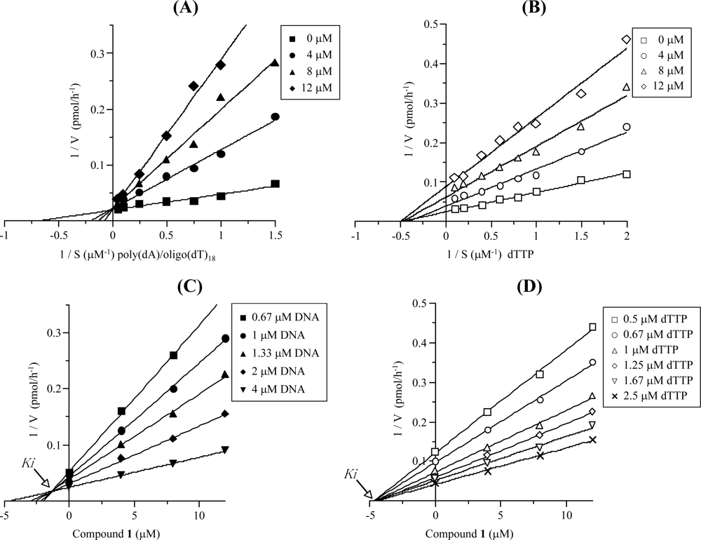 Kinetic analysis of the inhibition of human pol κ by compound 1. (A) Human pol κ activity was measured in the absence (closed square) or presence of 4 μM (closed circle), 8 μM (closed triangle) or 12 μM (closed diamond) compound 1 using the indicated concentrations of the DNA template-primer. (B) Human pol κ activity was assayed with the indicated concentrations of the substrate dTTP in the presence of 4 μM (open circle), 8 μM (open triangle) or 12 μM (open diamond) or in the absence (open square) of compound 1. (C) and (D) The inhibition constants (Ki) were determined as 1.3 and 4.4 μM from a Dixon plot made on the basis of the same data for (A) and (B), respectively. Amount of human pol κ in the assay mixture was 0.05 units.