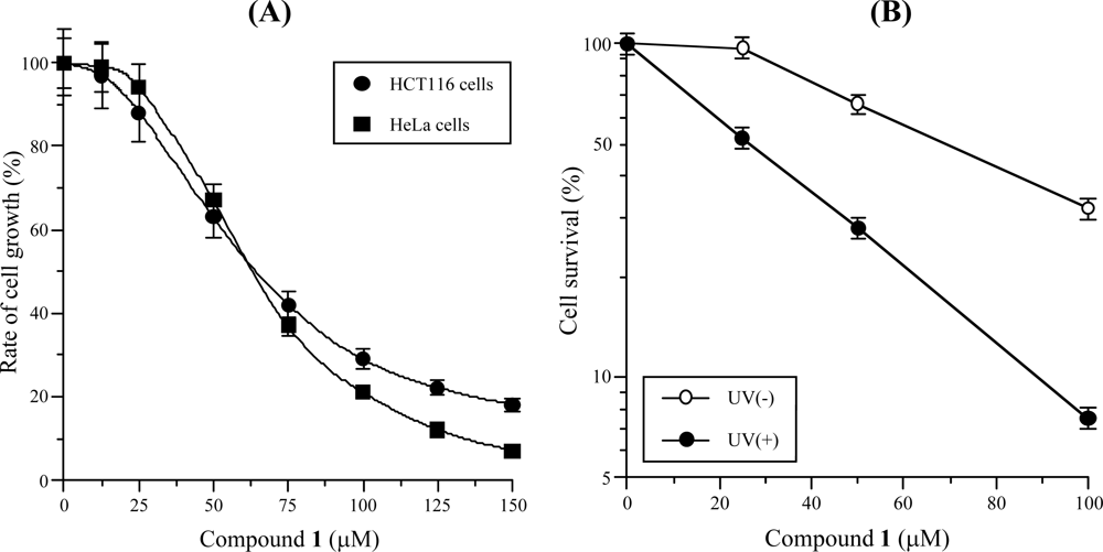 As shown in Figure 5A, compound 1 dose-dependently suppressed both HCT116 and HeLa cancer cell growth, and the LD50 value was 63.8 and 63.3 μM, respectively. Since the LD50 value of compound 1 for HCT116 cells was almost the same as that for HeLa cells, compound 1 might suppress all human cancer cell growth. The cell growth inhibition dose was approximately 1.3 to 5.1-fold higher than the enzyme inhibitory concentration, suggesting that the cause of the cancer cell influence might be the activity of pols. On the other hand, compound 1 did not influence the cell proliferation and growth of human normal cells such as HUVEC (human umbilical vein endothelial cells) and HDF (human dermal fibroblast) (data not shown); therefore, this compound might be a selective anti-cancer chemotherapy agent.