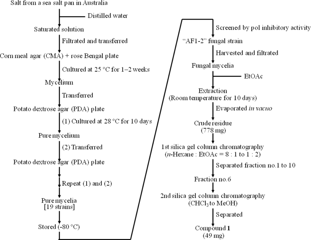 (Left) Isolation methods of marine fungal strains from Australian sea salt. (Right) Purification procedure of a compound with pol inhibitory activity from mycelia of “AF1-2” fungal strain.