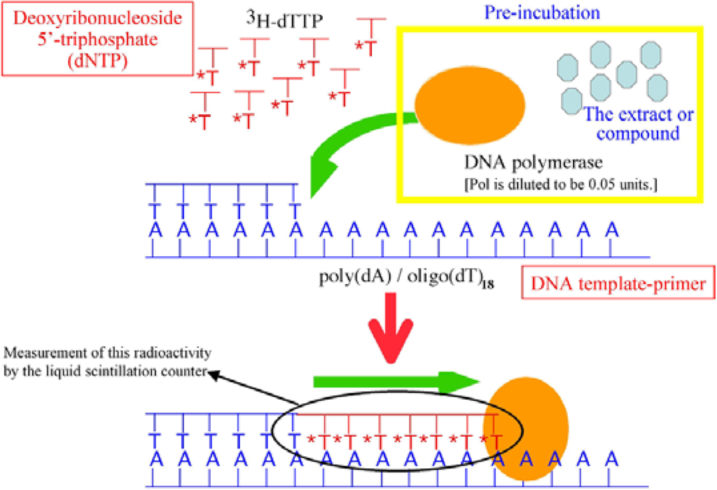 The compounds were dissolved in distilled dimethyl sulfoxide (DMSO) at various concentrations and sonicated for 30 sec. Aliquots of 4 μl sonicated samples were mixed with 16 μl of each enzyme (final amount 0.05 units) in 50 mM Tris-HCl (pH7.5) containing 1 mM dithiothreitol, 50% glycerol and 0.1 mM EDTA, and kept at 0 °C for 10 min. These inhibitor-enzyme mixtures (8 μl) were added to 16 μl of each of the enzyme standard reaction mixtures (final concentration of 50 mM Tris-HCl [pH 7.5], 1 mM dithiothreitol, 1 mM MgCl2, 15% glycerol, 10 μM poly(dA)/oligo(dT)18 and 10 μM [3H]-dTTP), and incubation was carried out at 37 °C for 60 min, except for Taq pol, which was incubated at 74 °C for 60 min. Activity without the inhibitor was considered 100%, and the remaining activity at each concentration of the inhibitor was determined relative to this value. One unit of pol activity was defined as the amount of enzyme that catalyzed the incorporation of 1 nmol dNTP (i.e., dTTP) into synthetic DNA template-primers in 60 min at 37 °C under the normal reaction conditions for each enzyme [7,8].