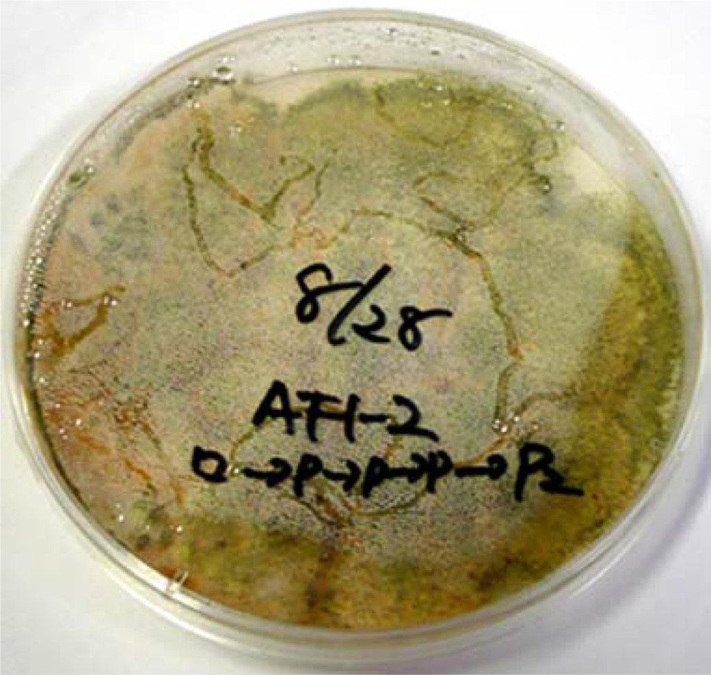 Natural salt (75 g) from an Australian sea salt pan was dissolved in distilled water (300 mL), and the saturated solution was filtered through a membrane filter (ADVANTEC, 0.2 μm, 47 mm). The filtered solution was placed on a corn meal agar (CMA) plate (Sigma-Aldrich K. K., Tokyo, Japan) containing rose Bengal (Junnsei Chemical Co., Ltd., Tokyo, Japan), and this plate was cultured for 1–2 weeks at 25 °C. Each grown mycelium on the plate was transferred to individual potato dextrose agar (PDA) (Difco Lab., KS, USA) plates, and cultured at 28 °C for 10 days. Each cultured fungus was transferred to a new PDA plate, and cultured at 28 °C for 10 days. Transformation and culture on PDA plates was repeated two to five times to obtain pure mycelium strains. The number of isolated and purified fungal strains was 19, which were stored at −80 °C (Figure 6, left).