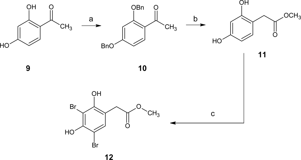 Methyl (2,4-dihydroxyphenyl)acetate (11, 1.50 g, 8.23 mM), N-bromosuccinimide (3.08 g, 17.29 mM) and p-toluenesulfonic acid (0.16 g, 0.82 mM) were added to methanol (80 mL) and stirred for 3 h at 40 °C in an ultrasonic bath. The solution was evaporated under vacuum. The residue was diluted with water and extracted with ethyl acetate. The organic layer was washed with brine, dried over anhydrous sodium sulfate, and concentrated under vacuum. The residue was purified on silica gel by column chromatography (ethyl acetate/hexane: 1/1) and 12 was thus obtained (2.04 g, 73%) as a white powder. 1H-NMR [400 MHz, (CD3)2SO]: δ 9.61 (s, 1H), 9.31 (s, 1H), 7.32 (s, 1H), 3.61 (s, 2H), 3.59 (s, 3H); 13C-NMR [100 MHz, (CD3)2SO]: δ 172.0, 153.2, 151.0, 133.4, 117.5, 103.3, 101.3, 52.3, 35.5; 1H-NMR [300 MHz, CD3OD]: δ 7.35 (s, 1H), 3.77 (s, 3H), 3.69 (s, 2H); 13C-NMR [75 MHz, CD3OD]: δ 174.1, 153.9, 152.0, 133.9, 117.6, 102.2, 101.2, 52.5, 36.3; APCI-MS: 337, 339, 341 [M-H]−; HRMS (CI, CH4): 337.8787 (Calc. for C9H8O479Br2, [M]−, 337.8789).