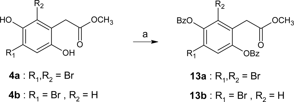 Treatment of 2′,4′-dihydroxyacetophenone (9) with potassium carbonate in the presence of benzyl chloride gave compound 10 in 73% yield. Willgerodt-Kindler rearrangement of 10 with thallium trinitrate and perchloric acid, followed by subsequent generation of hydroxyl groups in the presence of palladium 10% on carbon and ammonium formate gave compound 11. Electrophilic ring dibromination was then carried out with N-bromosuccinimide and p-toluenesulfonic acid as catalyst in MeOH under sonication to obtain 12 in good yield. Finally, to study the substitution of the two hydroxyl groups, the benzoylations of compounds 4a and 4b gave the two lipophilic products 13a and 13b (Scheme 3).