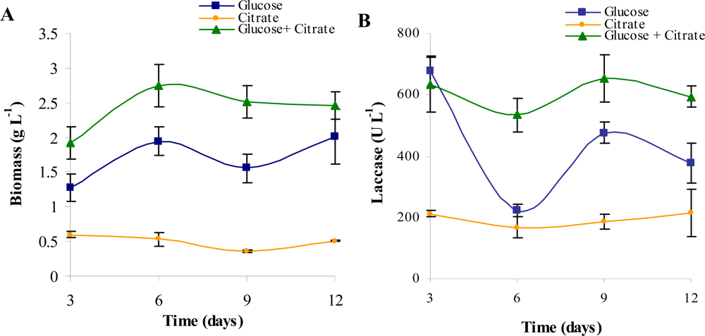 Effect of glucose and citrate on (a) Biomass and (b) Laccase production in a low nitrogen medium.