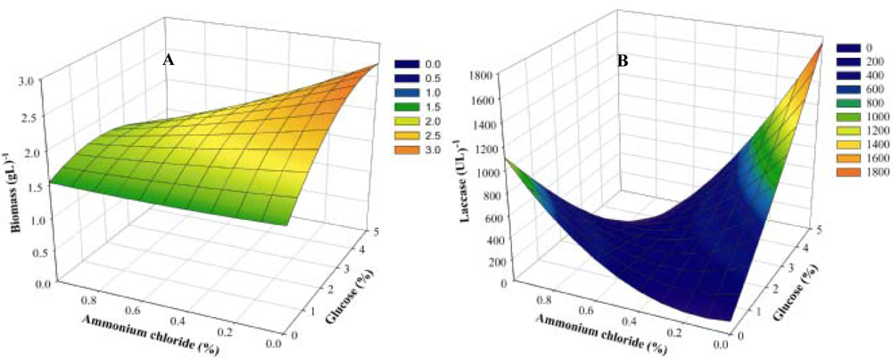 Surface plots for both biomass and laccase production elucidating the interaction between glucose and NH4Cl were plotted using the above equations (Figures 2a and 2b). Low concentrations of NH4Cl and high concentrations of glucose favored biomass production. The positive but low magnitude of the glucose coefficient indicated that biomass would increase to a limited extent with increasing glucose concentrations (Figure 2a). Levels of glucose and NH4Cl work antagonistically with each other, hence the inverted bell shaped curve obtained for laccase production (Figure 2b).