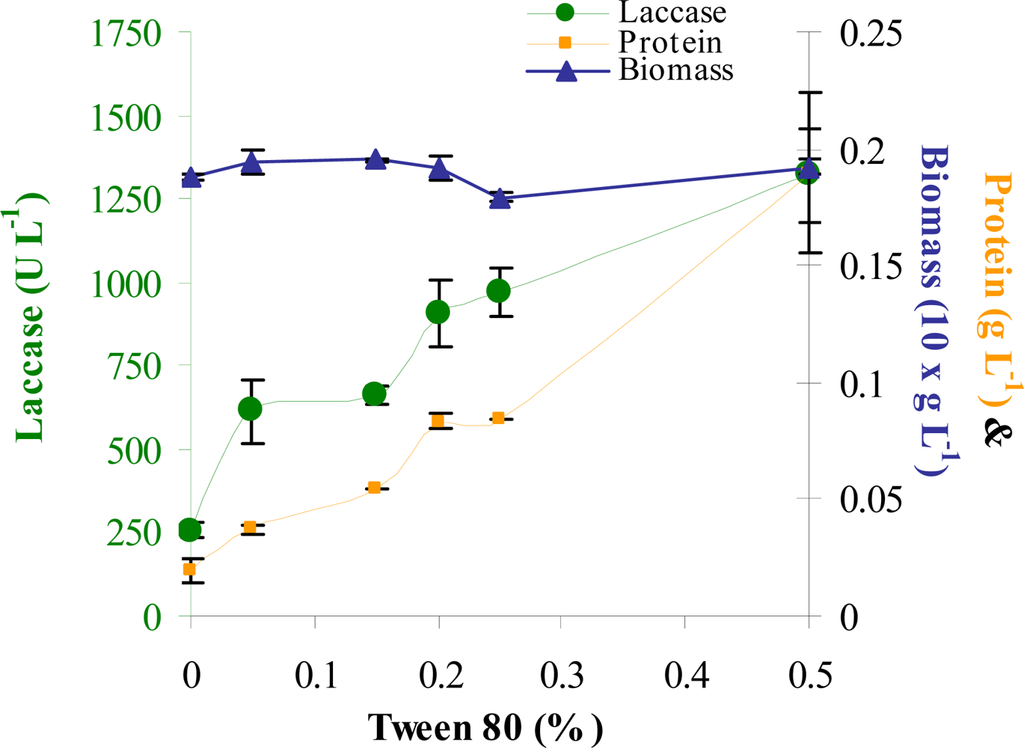 Effect of Tween 80 concentrations on laccase, biomass and protein production.