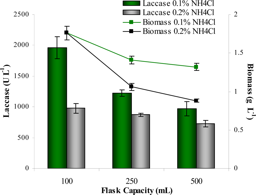 Effect of flask capacity on the production of biomass and laccase when grown in the presence of either 0.1 or 0.2% NH4Cl.