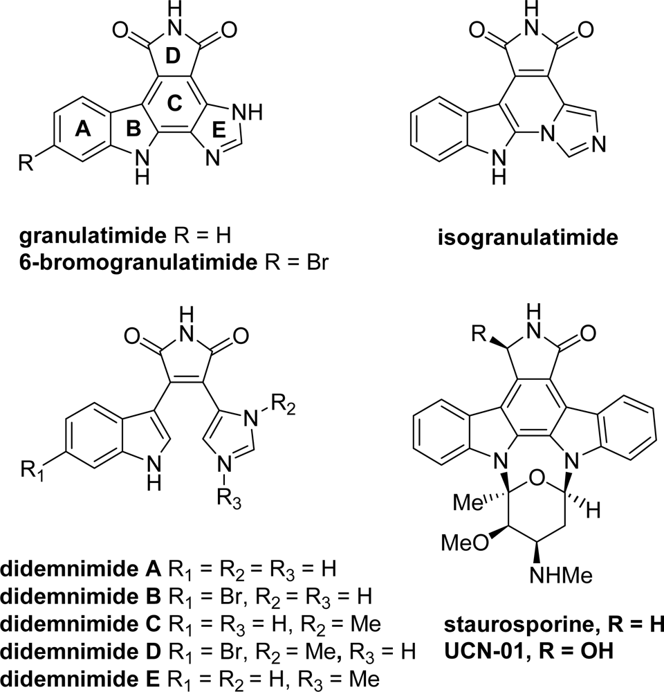 From a structural point of view, granulatimide and isogranulatimide possess a pyrrolocarbazole framework (i.e., heterocyclic system composed of units A, B, C and D) bearing a fused imidazole heterocycle (unit E, Figure 1). Other structurally related pyrrolocarbazoles, such as staurosporine or UCN-01, were also shown to be potent but non selective inhibitors of Chk1. In terms of kinase specificity, it is noteworthy that granulatimide and isogranulatimide also inhibit Cdk1 and GSK-3β, but show less potent inhibitory activity on several other protein kinases [14]. During the last decade, large structure-activity relationship studies were carried out on these compounds, which led to more potent and more selective molecules. Whereas a previous account by Hénon et al. was devoted to pyrrolocarbazoles as Chk1 inhibitors [15], the present review will update and enlarge this topic, focusing on synthesis and kinase inhibition profile of analogues of the marine metabolites.