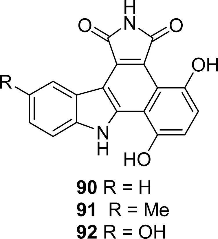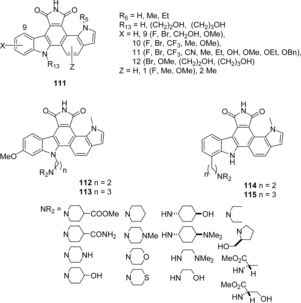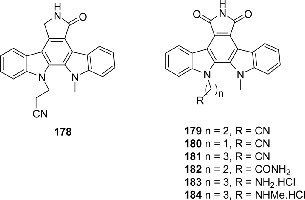 In the course of structure-activity relationship studies on granulatimide as Chk1 inhibitors, substituted pyrrolocarbazoles 212–215 in which the upper imide-type unit D is missing and pyrrolocarbazoles 216 and 217, in which the imidazole unit E is missing were investigated [79] (Figure 19).