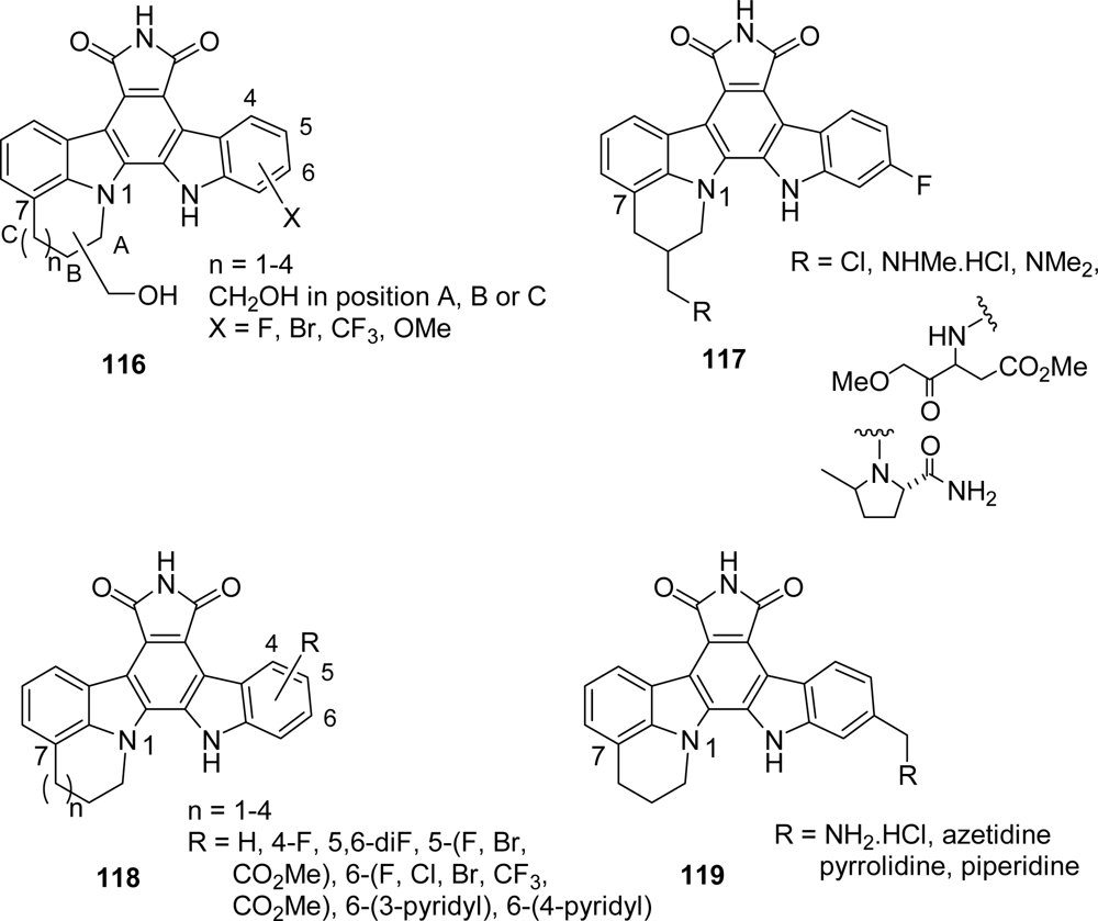 The main modifications of the indole moiety consisted of: (i) introduction of substituents, (ii) replacement of this cycle by an azaindole unit, (iii) introduction of a glycosyl moiety attached to the indole nitrogen [15]. All of these compounds were proved to be poor Chk1 inhibitors, the presence of a methyl group on the imide nitrogen may be contributing to this negative result [24].