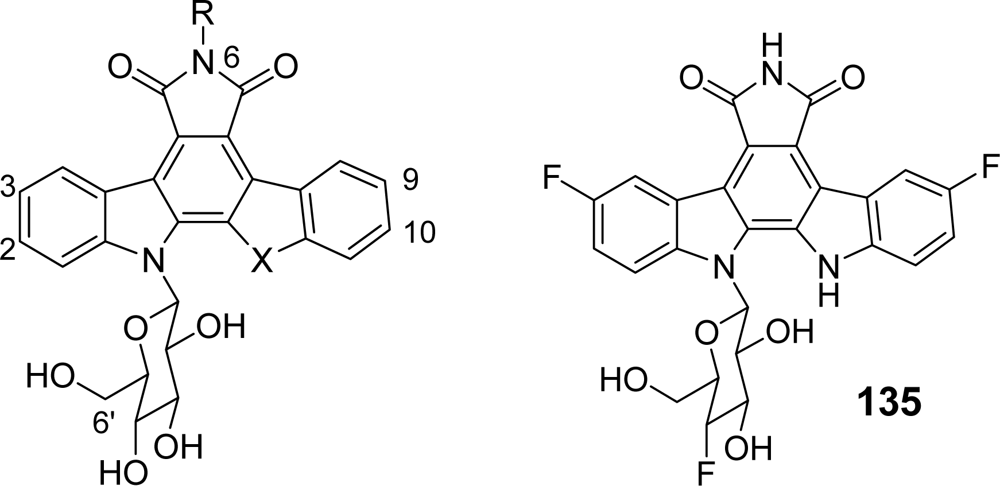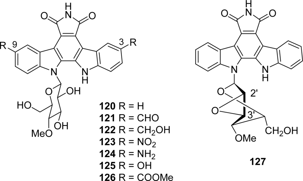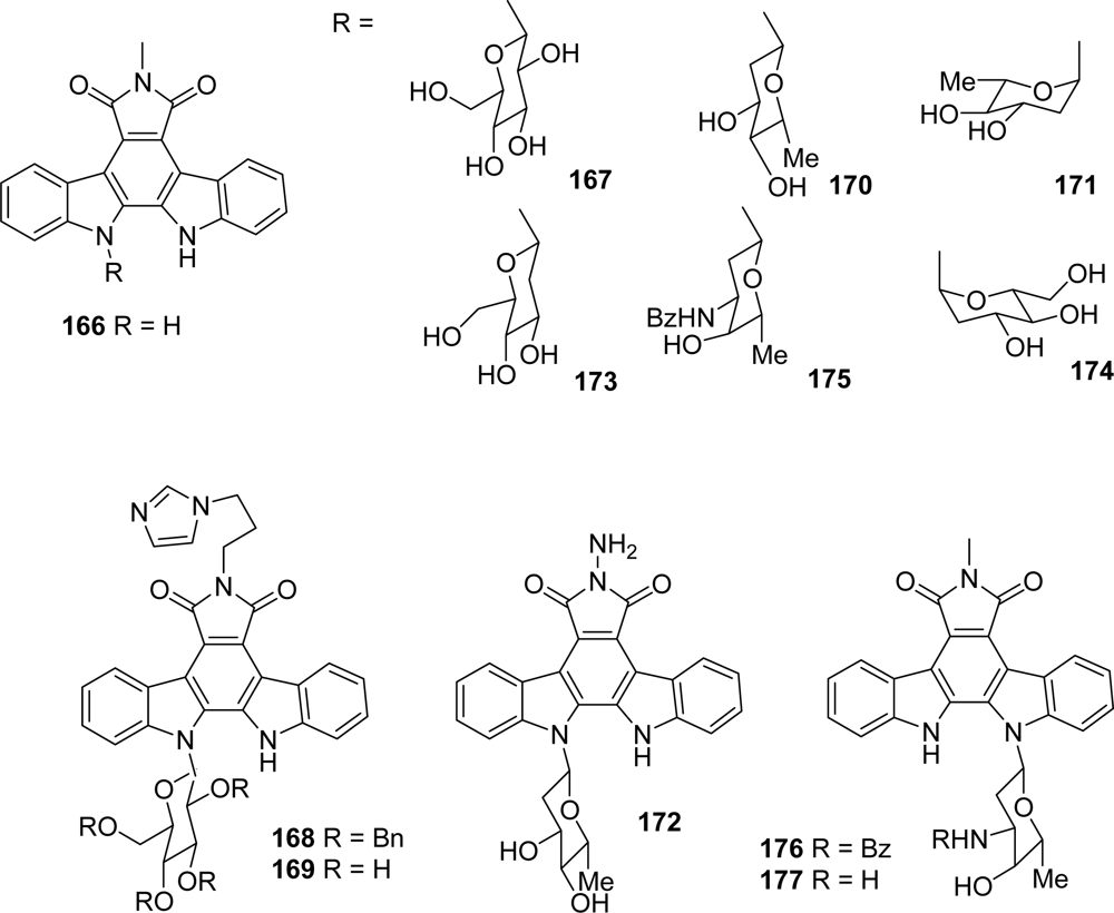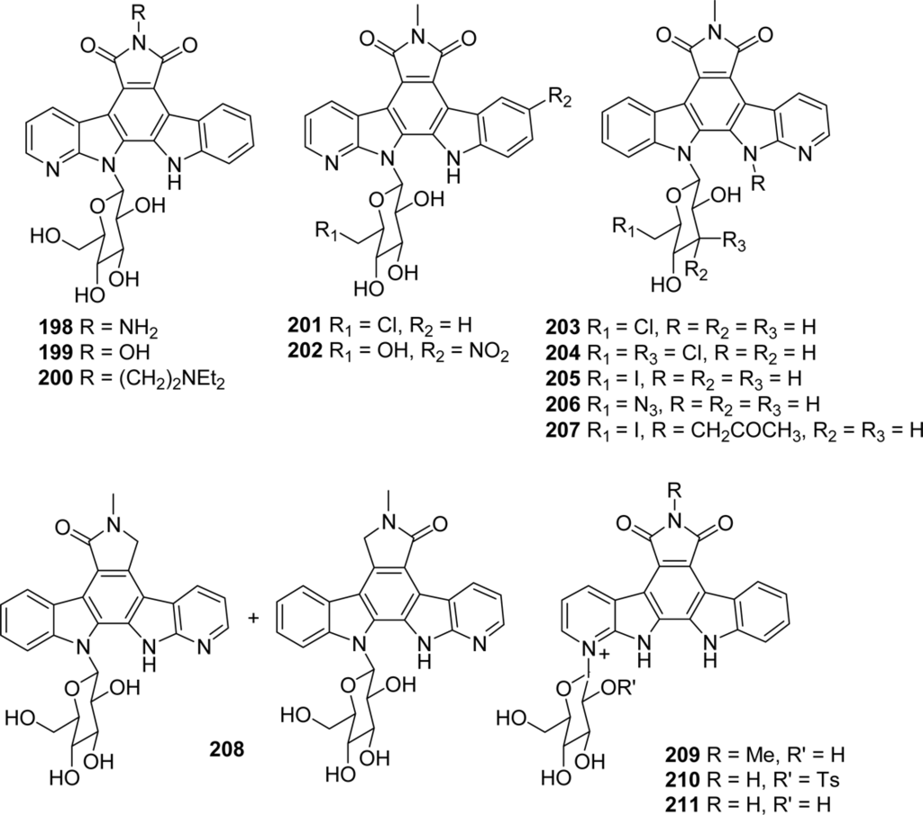 In the next proposed series, the modifications have been carried out together on the upper heterocycle (introduction of substituents on the imide nitrogen or replacement of the imide by a lactam function), on the carbazole framework and the sugar part, this last unit being linked either to the azaindole moiety (198–202) or to the indole (203–208) [77] (Figure 18).