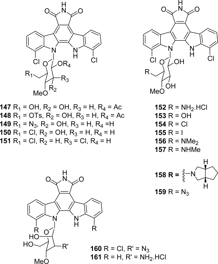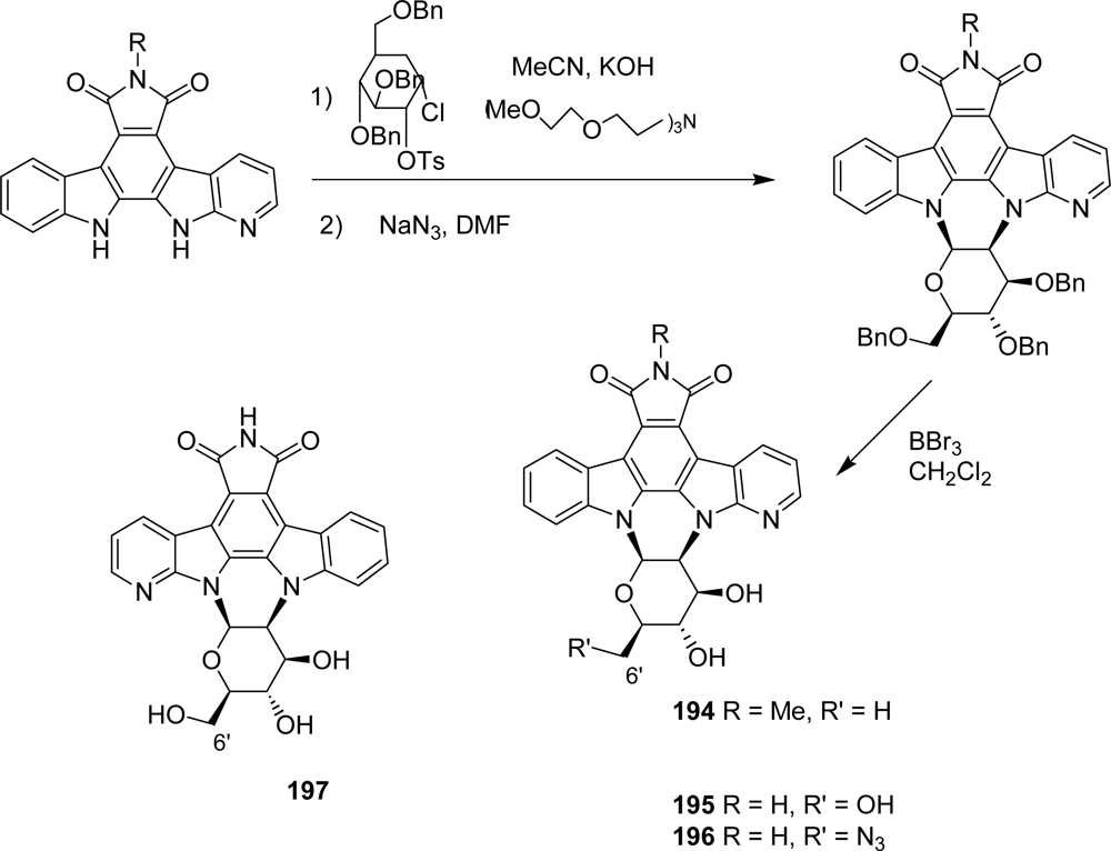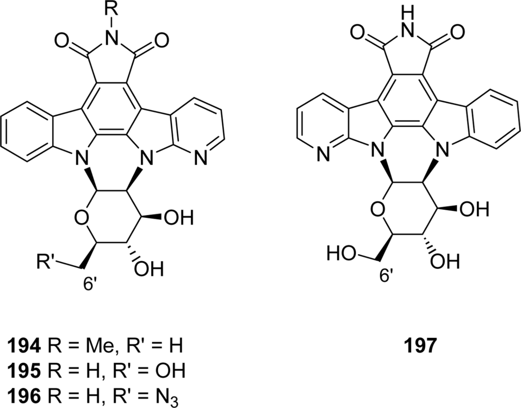 A previous report described the preparation of compound 194 which could be achieved by coupling a chloro sugar moiety previously tosylated in 2’-position to the corresponding azaindolocarbazole aglycone and subsequent reaction with sodium azide in DMF [75] (Figure 17). A series of compounds 195–197 bearing a free imide nitrogen and in which the oxygen of the pyranose heterocycle is oriented toward either the indole or the azaindole unit was then proposed [76]. The same methodology was applied to synthesize the derivative 196 using a 2’-tosylated instead of a 2’-chloro glycosyl donor. No data on cytotoxicity and inhibitory activities of these compounds towards various kinases are available so far.