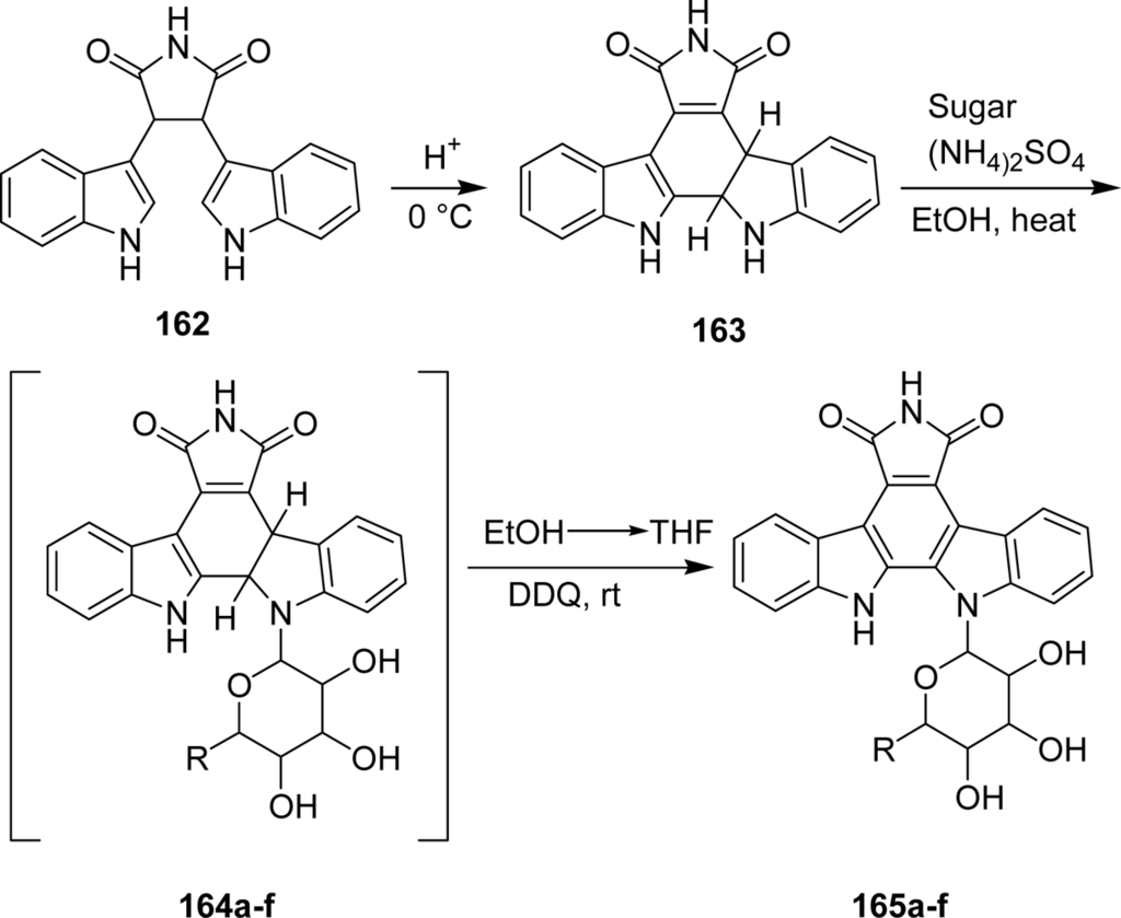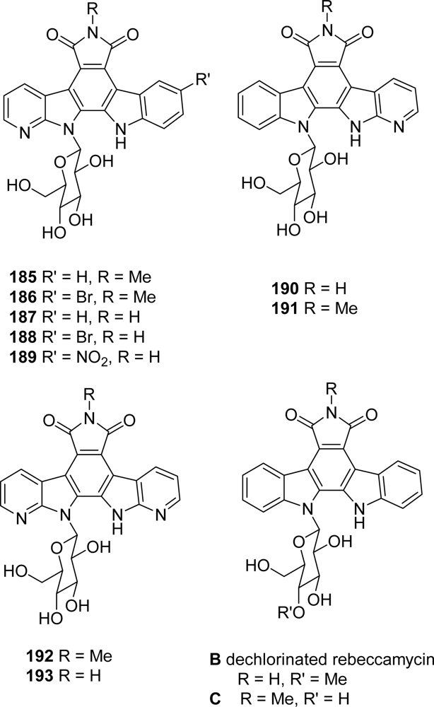In a second series of analogues 192–193, the two indole moieties of rebeccamycin were replaced by two aza-indole units (Figure 16). The compounds were synthesized according to strategies already described. Depending on the expected product, the sugar part was introduced before or after the cyclization which formed the central benzenic ring (i.e., unit C). In the case of post-glycosylation approach, the substitution of the 9-indole hydrogen was realized in the last step. The DNA-binding and topoisomerase I inhibition properties of the new compounds were investigated together with the antiproliferative activities toward nine tumor cell lines and their effects on the cell cycle of L1210 leukemia cells. In contrast to their non-azaanalogues (rebeccamycin, dechlorinated rebeccamycin B and compound C), which were cytotoxic for all the cell lines tested, the azaanalogues showed a selective action toward certain cell lines in the nanomolar range. All compounds induced similar cell cycle effects, with a marked G2+M block observed with L1210 leukemia cells. In addition, the sugar unit linked to the indole moiety promoted higher affinity for DNA whereas compounds with the sugar linked to the azaindole moiety have lost their DNA-binding affinity. In these series, a good correlation between DNA binding and topoisomerase I inhibition was observed. These data suggest the possibility of targets other than DNA and topoisomerase I for the azaanalogues.