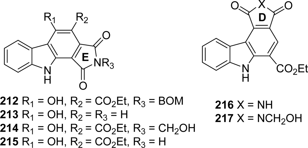 The compounds of the first series were synthesized via compound 212 itself obtained by reaction of ethyl-3-oxo-(1H-indol-3-yl)propionate and N-BOM-dibromomaleimide whereas the derivatives of the second series were prepared on the basis of a Diels-Alder reaction between indolylmaleimide and ethyl acrylate. Concerning biological activities, it appeared that compounds in which the upper unit D was missing, were poor Chk1 inhibitors suggesting that this ring is required for Chk1 inhibition. In contrast, the lower heterocyclic unit E is not absolutely required for Chk1 inhibition. Moreover, it seems that substitution of the imide nitrogen with a hydroxymethyl group was not detrimental to Chk1 inhibitory activity.