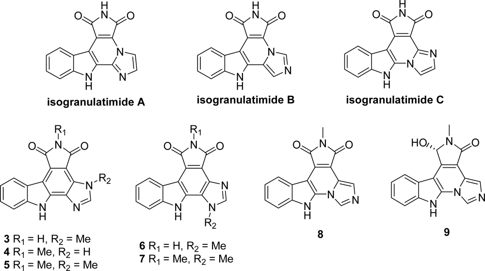 The synthesis of positional analogues of granulatimide and isogranulatimide were also reported, mainly modified at the level of the imidazole ring. The first derivatives were synthesized by Piers et al. who prepared isogranulatimide A-C and 17-methyl granulatimide 3 by using the synthetic route they defined for the natural product [21] (Figure 2). Among them, the most interesting compounds isogranulatimide B and isogranulatimide C inhibited the G2 checkpoint with IC50 values of 1 and 6 μM, respectively and Chk1 with IC50 of 2.3 and 0.65 μM respectively.