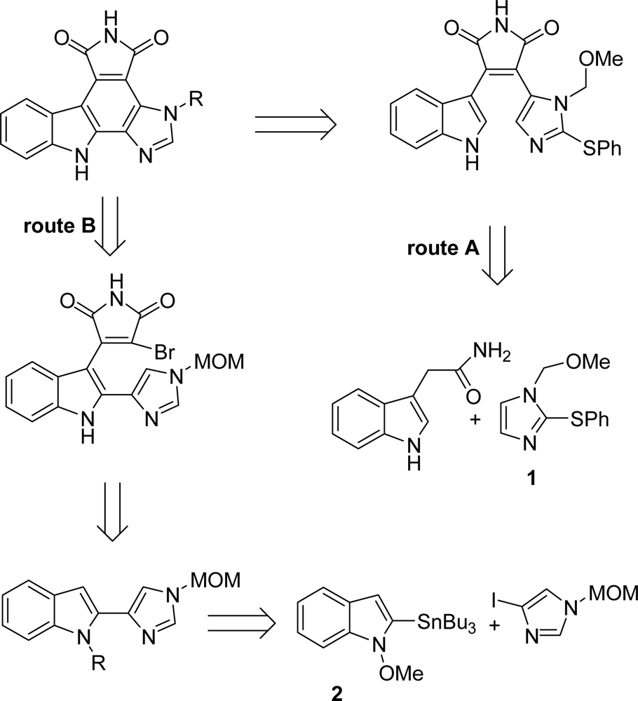 Since granulatimide and isogranulatimide have been shown to be abrogators of the cell-cycle G2-M phase checkpoint, two efficient synthetic routes have been developed for these compounds (Scheme 1). The first one by Piers et al. proceeded via their putative biosynthetic precursor didemnimide A and was based on the condensation of the substituted imidazole 1 with indole-3-acetamide (route A) [21]. The other one proposed by Yoshida et al. relied on a key Stille coupling reaction between stannylindole 2 and 4-iodoimidazole in the presence of PdCl2(PPh)3 [22] (route B).