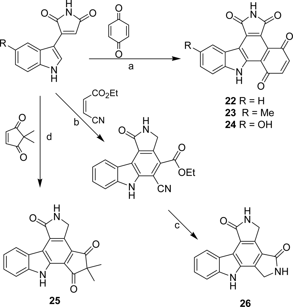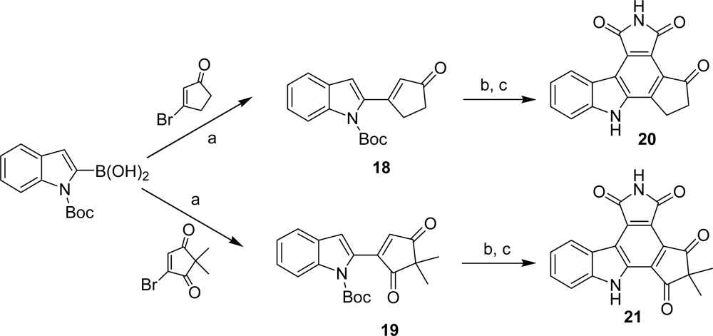 A series of pyrrolocarbazoles 18–26 in which the imidazole heterocycle has been replaced by a five- or a six-membered ring carbocycle bearing one or two carbonyl functions have been published by Conchon et al. [27,28]. The compounds of the series were obtained either on the basis of a Suzuki coupling between 2-N-Boc-indoleboronic acid and 3-bromocyclopent-2-enone or 4-bromo-2,2-dimethylcyclopent-4-ene-1,3-dione followed by a Diels-Alder reaction of the adducts with maleimide (Scheme 2) or via a Diels-Alder reaction between 3-indolylmaleimide or 5-substituted-3-indolylmaleimide and different dienophiles such as cyclopent-2-enone, cyclohex-2-enone, hydroquinone, 2,2-dimethylcyclopentenedione and ethyl cis-β-cyanoacrylate (Scheme 3).