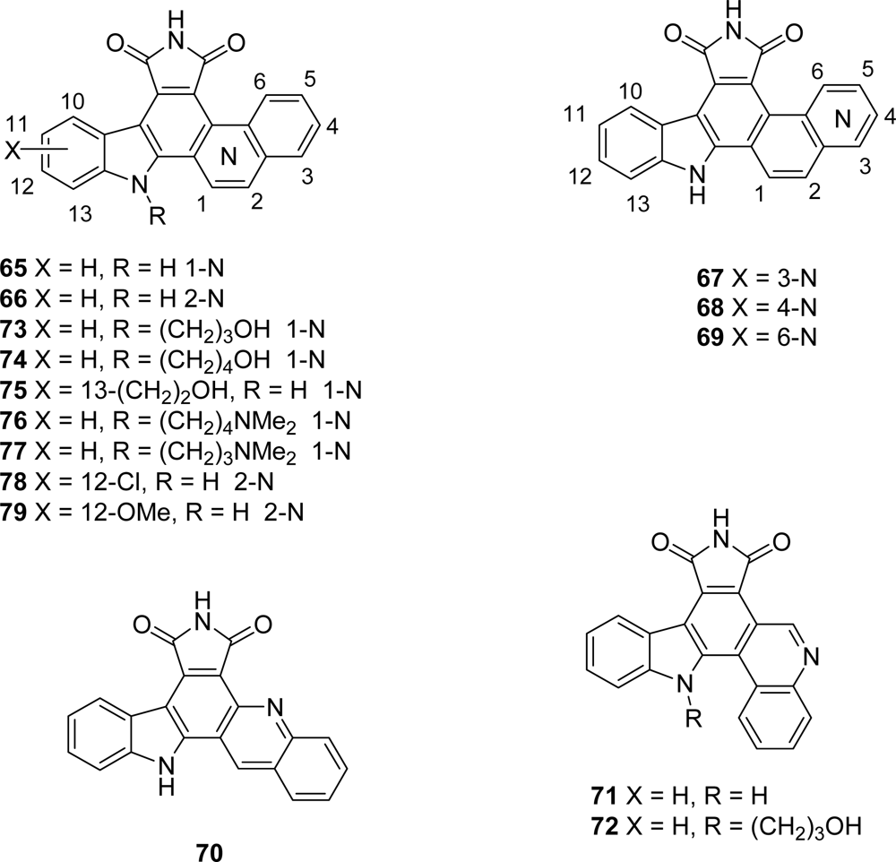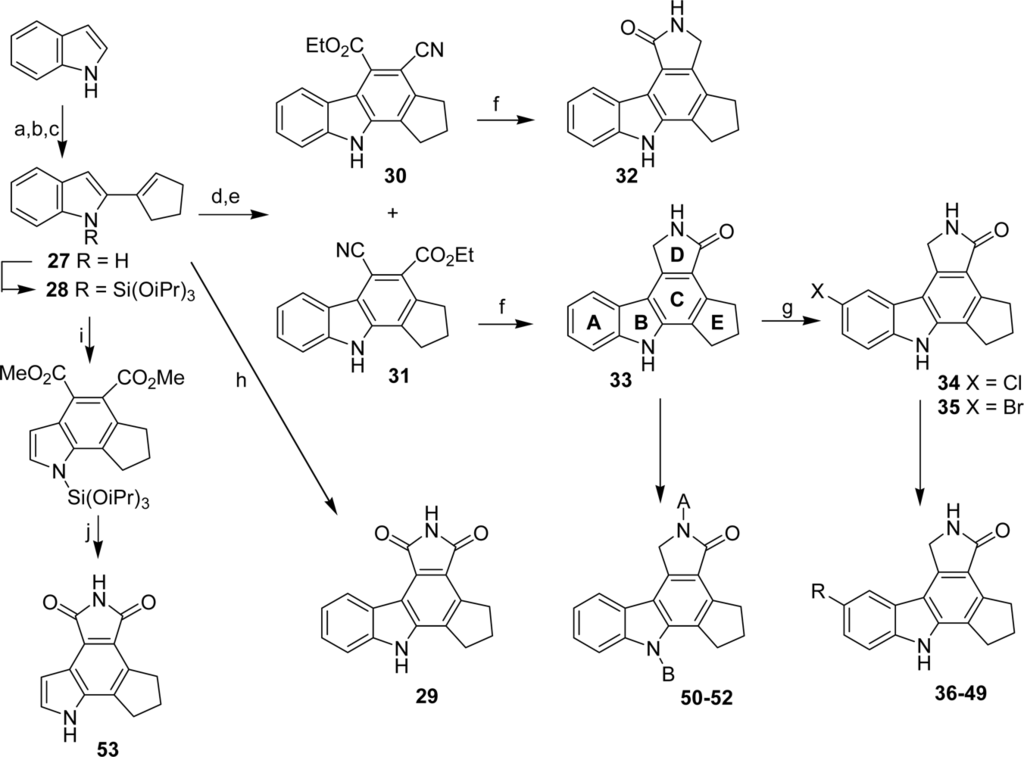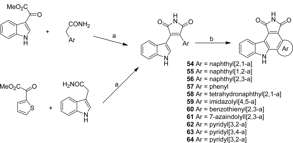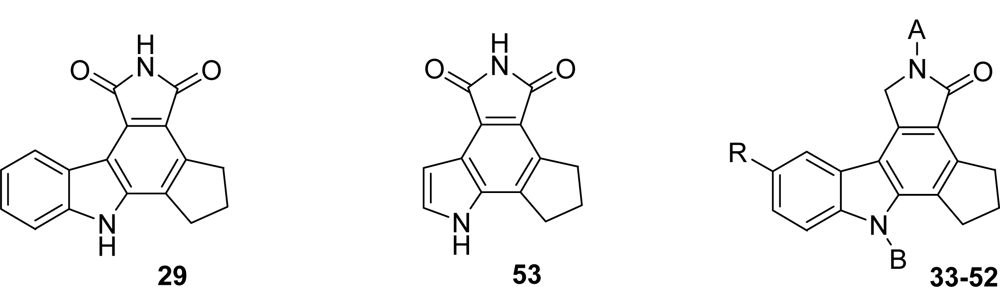 Cyclin-CDK complexes regulate the progression of cells through the cell cycle, a G1-phase role being suggested for d-type cyclins through association with CDK4 and CDK6. Since abberations in CDKs and their regulators have been found in a large percentage of human tumors, inhibitors of these cyclin-CDK complexes might have a broad range of therapeutic applications in cancer. The preparation of the compounds was accomplished following Faul’s general synthetic route to access the 3-heteroaryl-4-indolyl maleimides which were cyclized either by using APTS as catalyst or by oxidative photochemistry [32,33]. Their inhibitory activity against cyclin D1-CDK4 was evaluated. From all the compounds, the naphtyl[2,1-a] derivative 54 was proven to be a potent and selective inhibitor (IC50 = 45 nM).