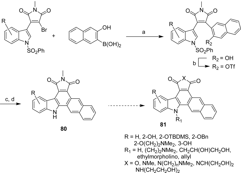 From a second series 65–79, in which the [3,4-c]carbazole core was fused with a quinolyl or isoquinolyl moiety, compound 68 was found to be the highest potent D1-CDK4 inhibitor with an IC50 of 69 nM (Figure 4). This last compound inhibited tumor cell growth, arrested tumor cells in G1-phase and inhibited pRb phosphorylation [34]. In 2005, Routier et al. were interested in pyrrolocarbazole-fused naphthalenes and reported an efficient route to these family of compounds 81 involving palladium-catalyzed reactions to prepare them (Scheme 6) [35].