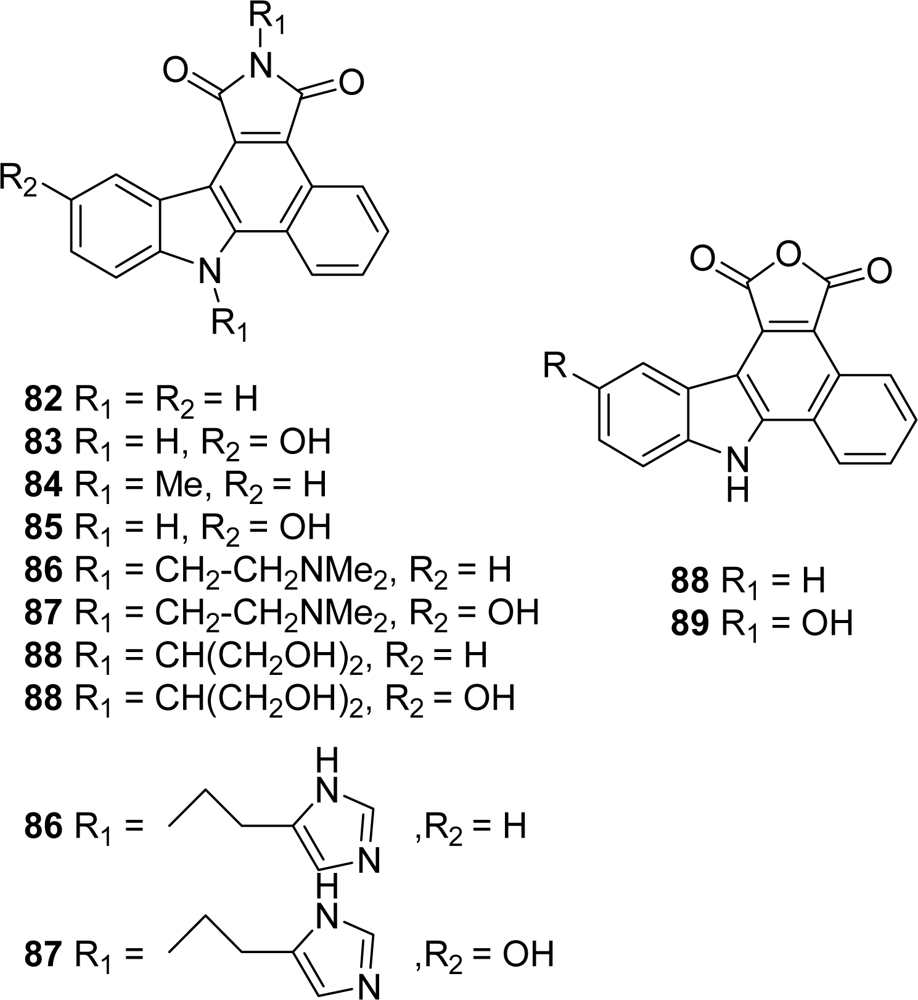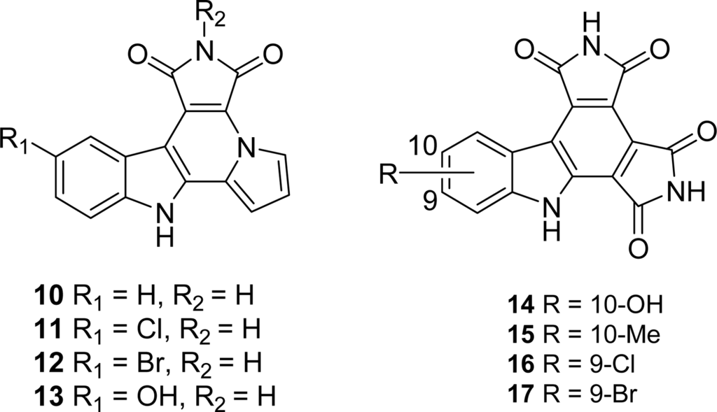 Most of the granulatimide derivatives clearly represent a promising class of antitumor agents due to their potent inhibitory activity against different kinases. Recent reports on indolocarbazole analogues have shown that minimal structural modifications are able to modify both the biological targets and induce selectivity towards tumor cell lines. For instance, substitutions in 3,9-positions of the rebeccamycin framework may induce strong inhibitory properties toward various kinases and selectivity toward the tumor cell lines. The same observation is also valuable in the case of pyrrolocarbazole analogues which means that it could be of interest in these carbazole series to evaluate systematically the different compounds toward a large panel of kinases, such a profile of kinase selectivity being obtainable thanks to modern high-throughput technologies [80,81].