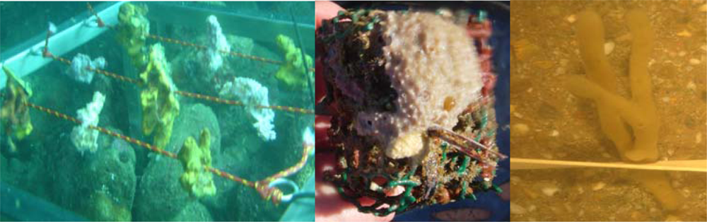 Sipkema et al. [4] concluded that whole sponge culture is the most promising option for large scale production of higher concentrated metabolites like avarol, which is produced up to 3 g per kg sponge wet weight [54] in Dysidea avara. Especially for faster growing sponges containing large amounts of metabolites whole sponge culture is potentially interesting. It was determined that sea-based culture is economically cheaper than land-based culture [4]. The major drawback of culturing sponges is that many sponges were found to be slow or variable growing organisms both in the sea [55–60] as well as in the laboratory [61–67]. Studies have demonstrated that production of metabolites in cultured sponges was sometimes lower [57], but on the other side also higher production rates were found [11,68] than in sponges harvested from the sea. Apart from the costs, sea-based culture is less desirable than land-based culture as the conditions cannot be controlled in the sea, and the sponges are vulnerable to diseases and parasites. Several attempts have been made to culture sponges on land. Most of the research focused on food requirements, which is thought to be the key to success [69]. Sponge cultures in the sea can be done using different structures for attaching sponges (Figure 3), and harvesting could be done partially thus leaving explants behind to re-grow. Sea-based cultivation is still the method where the largest growth rates have been obtained. Apparently, the artificial environment we construct for the sponges still cannot replace the complexity of the sea. A good alternative for this is to culture sponges on land but still use natural seawater flowing through the aquaria containing the sponges. Despite several growth studies still very limited understanding is present about the exact needs of sponges to improve growth. Therefore, before sponge culture systems can be realized more understanding is necessary about food, attachment surfaces and other requirements that stimulate sponge growth.