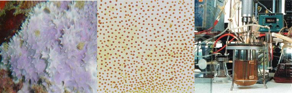 Development of sponge cell-lines. (A) Dysidea avara (B) cells isolated from Dysidea avara (C) bioreactor to culture animal cells.