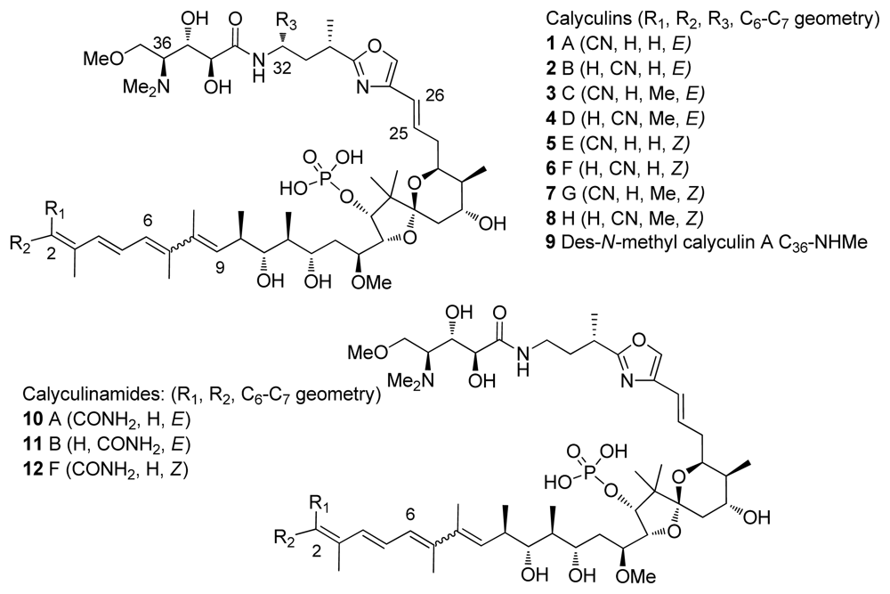 Calyculins are a class of highly cytotoxic metabolites originally isolated from the marine sponge Discodermia calyx by Fusetani and co-workers. The first member, calyculin A, was isolated in 1986 from a sponge collected in the Gulf of Sagami, near Tokyo Bay [8–15]. The sponge still remains the primary source of the natural product. The structures of different calyculins and structurally-related calyculinamides are shown in Figure 1. The most naturally abundant members of the family are calyculins A and C.