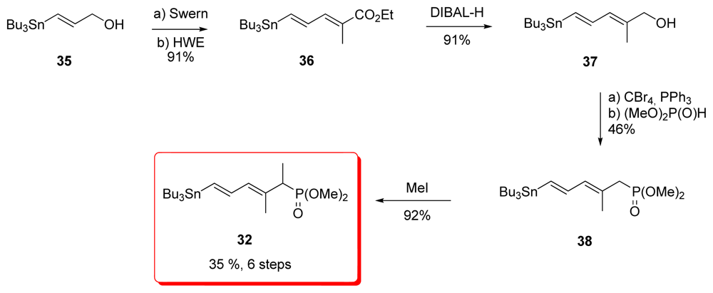 Evans’ synthesis of phosphonate diene 32 began with vinyl stannane 35 which was prepared by reduction of methyl (E)-3-(tributylstannyl)-2-propionate (Scheme 4). Swern oxidation followed by HWE reaction gave diene ester 36 as a 19:1 E:Z mixture. Reduction of the ester furnished alcohol 37, which was converted to phosphonate 38 by the Michaelis-Becker method. Final methylation of 38 completed the synthesis of targeted phosphonate 32.