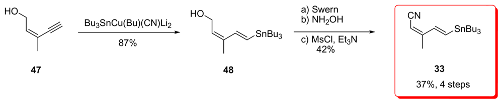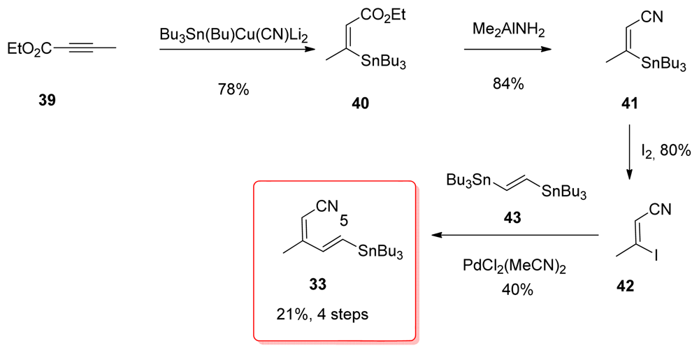 For the preparation of stannane 33, Barrett et al. used a strategy similar in every aspect to the one presented earlier by Masamune; however, as mentioned before, Masamune’s results were not published. Conjugate addition of tributylstannyl cuprate to ethyl butynoate 39 gave (Z)-enoate 40. Conversion of ethyl ester of 40 to the corresponding nitrile 41 was achieved via the amide in 2 steps. Metal-halogen exchange furnished vinyl iodide 42 and Stille coupling with 43 were the lasts steps for the preparation of 33.
