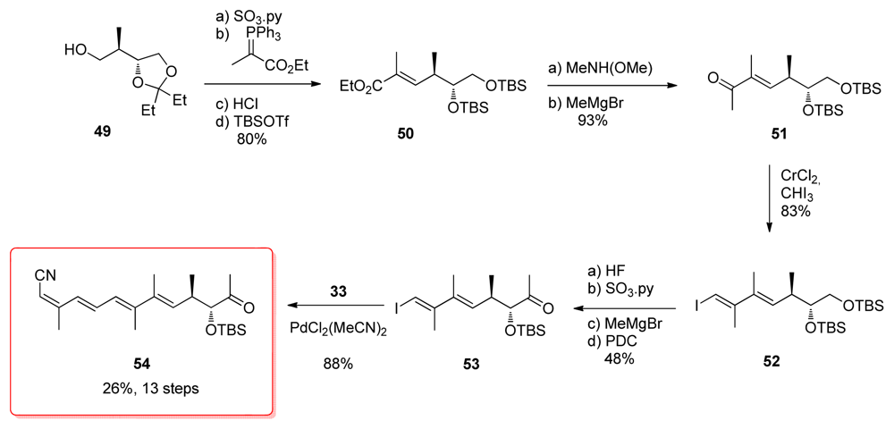 Shioiri group’s strategy was to introduce the whole tetraene, actually the C1–C12, as a single moiety to the rest of the target molecule. Stannyl cupration of alcohol 47 was the key step, affording the stannyl derivative 48 in 87% yield. Further conversion of the alcohol to the corresponding nitrile generated 33 (Scheme 7).