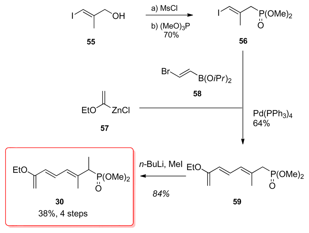 Smith et al. began by synthesizing the iodo phosphonate 56 in two steps from allylic alcohol 55 (Scheme 9). This was followed by a two stage one-pot coupling of the three components. The first part, the Negishi coupling of the organozinc compound 57 with bromoboronate 58 was followed by a Suzuki coupling with iodide 55 affording phosphonate 59 in 64% yield. Final methylation of 59 furnished 30.