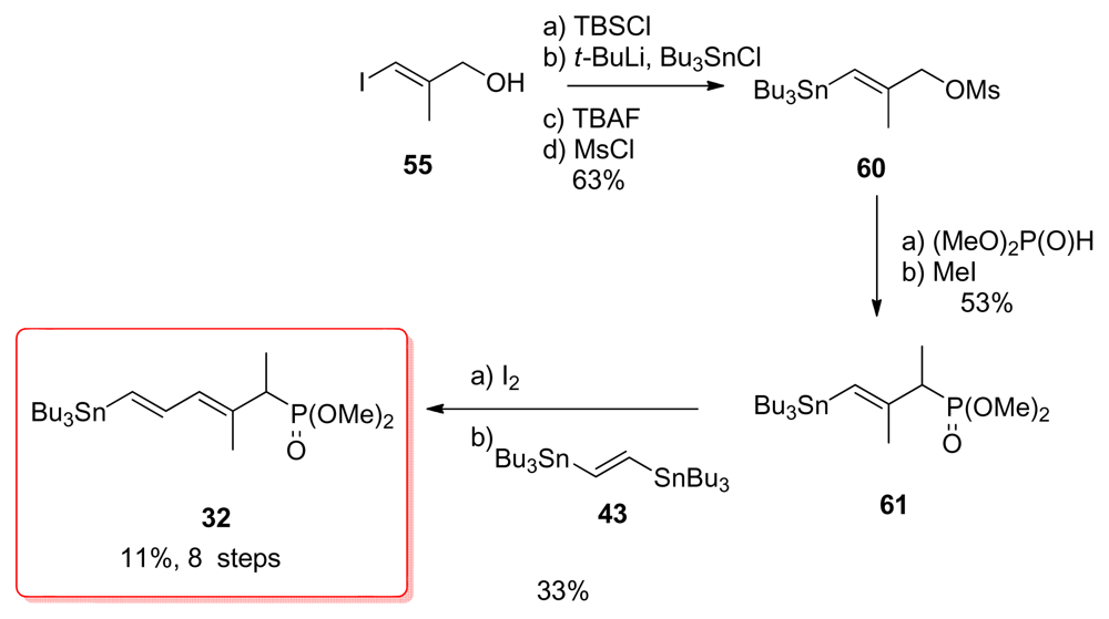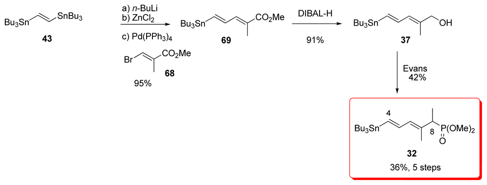Koskinen et al. reported a short and efficient synthesis of alcohol 37, which was used by Evans for the preparation of phosphonate 32 (Scheme 13). Sequential treatment of distannyl compound 43 with n-BuLi and ZnCl2, followed by Pd-catalyzed Negishi coupling with bromo-ester 68, furnished diene 69 in 95% yield. Reduction with DIBAL-H afforded the alcohol 37. Introduction of the phosphonate moiety included bromination, Michaelis-Becker reaction and final methylation, following the procedure published by Evans et al. [18] gave 32.