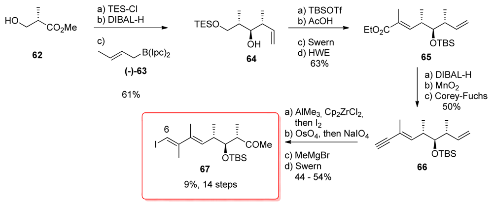 The key idea of the synthesis of the C6-C14 fragment was to construct the vinyl iodide 67 via methyl zirconation–iodonolysis of alkyne 66 using Negishi’s procedure (Scheme 12). The synthesis started with commercially available methyl (S)-3-hydroxy-2-methylpropanoate (62) which was efficiently converted to homoallylic alcohol 64 by Brown’s homologation with (−)-63 [54,55], setting the stereochemistry at C11 and C12 with excellent diastereomeric excess (>96%). Further standard steps led to ester 65, which was then reduced to aldehyde and homologated to the corresponding alkyne 66 using the Corey-Fuchs protocol. Methylzirconation-iodinolysis of 66 furnishing the corresponding vinyl iodide and final formation of the methyl ketone at C14 were the final steps for the preparation of 67.