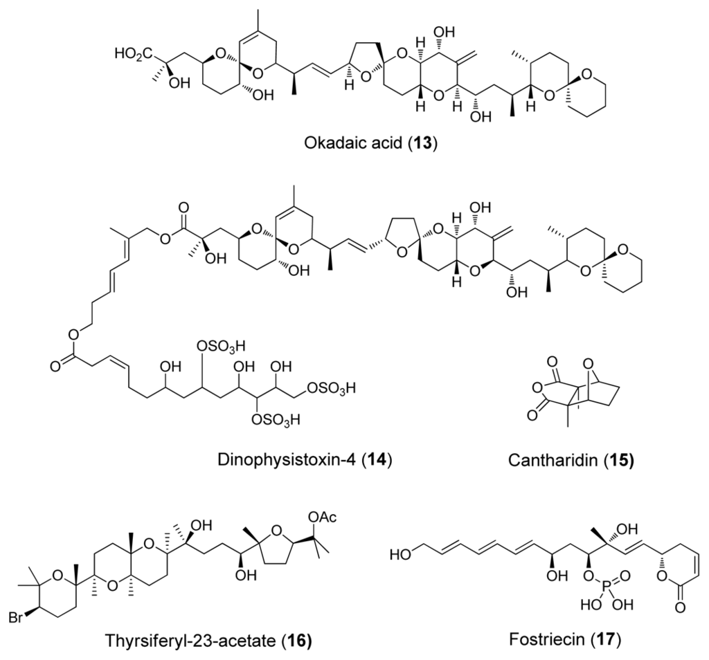 - Sheppeck, JE; Gauss, C-M; Chamberlin, AR. Inhibition of the ser-thr phosphatases PP1 and PP2A by naturally occurring toxins. Bioorg Med Chem 1997, 5, 1739–1750. [Google Scholar]