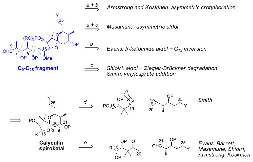 Altogether six total or formal synthesis of calyculins have been published. These syntheses can be divided into three groups: