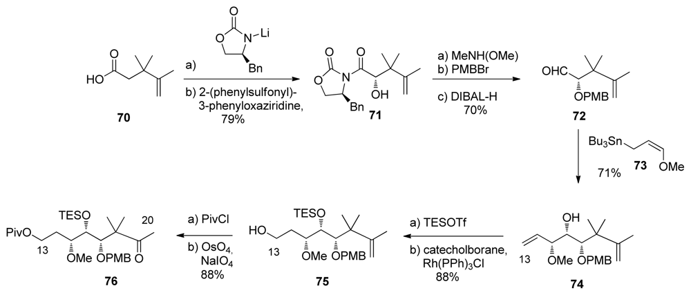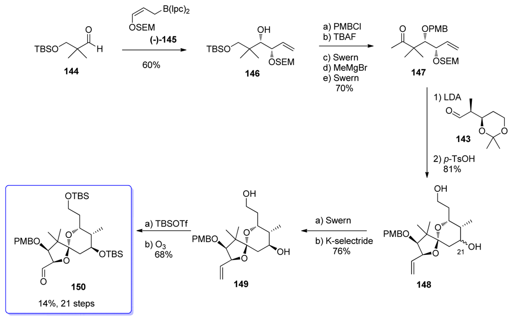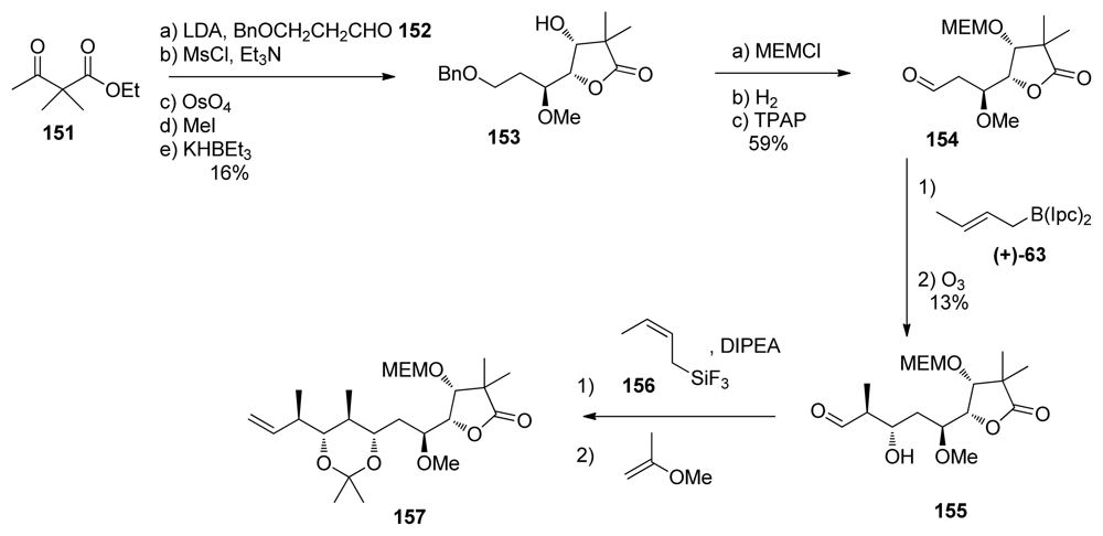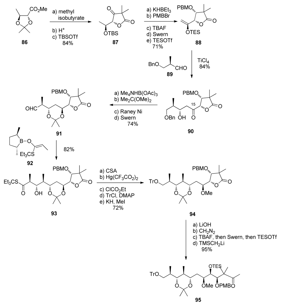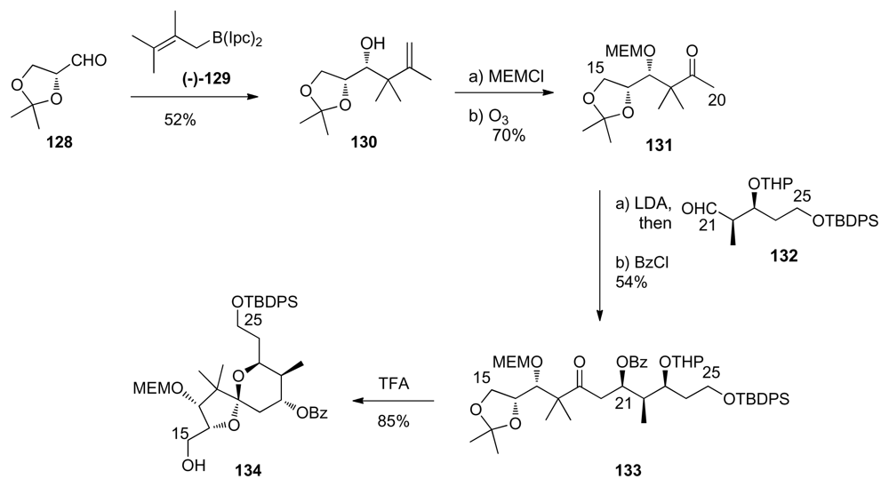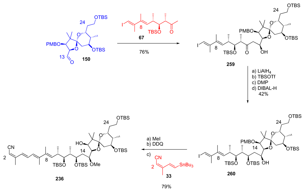 Aldol reaction between methyl ketone 67 and aldehyde 150 gave in a diastereoselective manner β-hydroxyketone 259, unfortunately carrying the wrong stereochemistry at C15 (Scheme 58). LiAlH4 reduction at C13 furnished the corresponding diol in 73%, together with its C13-epimer in 15% yield. Selective monosilylation at C13 was followed by inversion of stereochemistry at C15 by successive Dess-Martin oxidation and DIBAL-H reduction to produce 260. O-Methylation at C15, PMB-removal at C17 and final Stille coupling with stannane 33 finished the synthesis of Evans’ intermediate 236.