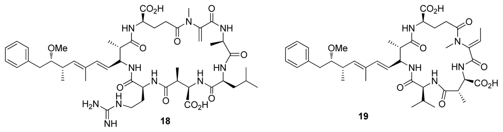 Cyclic peptides such as microcystins (e.g., microcystin–LR (18)) and nodularins were initially isolated from blue green algae and are potent inhibitors of PP1 and PP2A, but poor PP2B and PP2C inhibitors. Another cyclic peptide motuporin (19), also known as nodularin-V, was isolated from the marine sponge Theonella swinhoei gray (Figure 3) [4]. Both microcystins and motuporin share the rare aminoacid ADDA, which interacts with the hydrophobic groove of PP1.