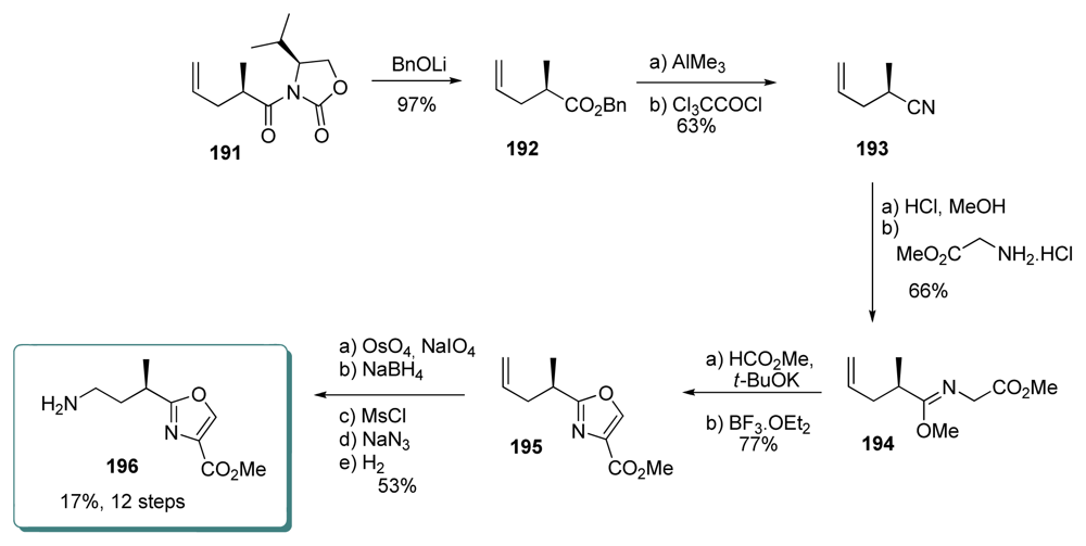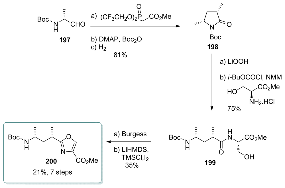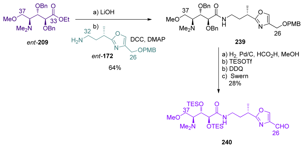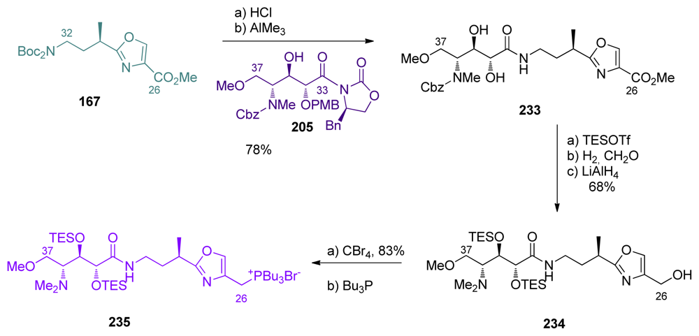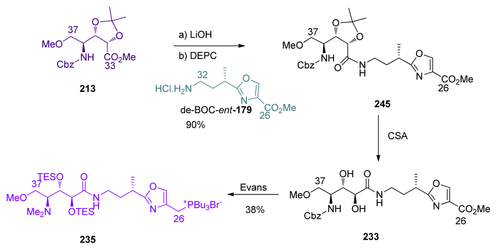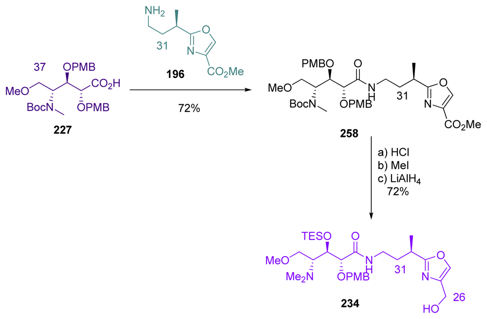 Barrett et al. last steps for completing the total synthesis of ent-1 began with the coupling of aminoacid 227 and oxazole 196 fragments, to give amide 258 (Scheme 57). The latter was then converted to Evans’s intermediate 234, by a three-step/one-pot sequence involving Boc-deprotection, N-methylation and reduction of the ester at C26.
