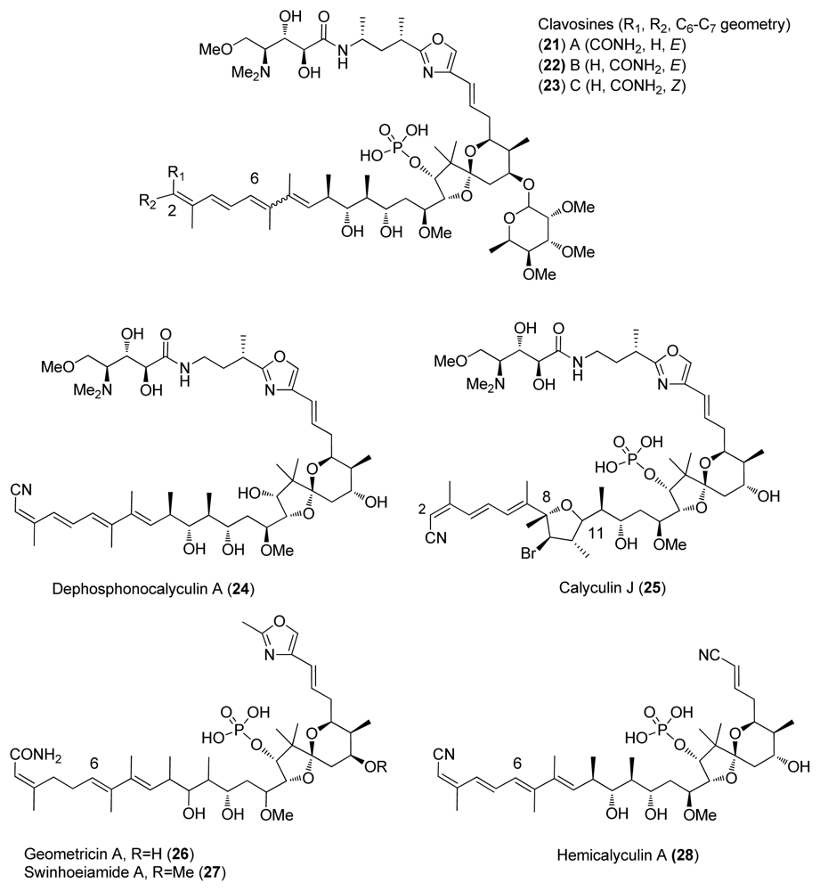 Calyculin related structures have also been found from other marine sponges, such as Lamellomorpha strongylata which was collected at the Chantam Rise off the East Coast of South Island of New Zealand in 1995 and whose extraction afforded calyculinamides A (10) and B (11) [10]. Calyculinamide A (10), calyculinamide F (12), des-N-methyl calyculin A (9), and dephosphocalyculin A (24) were isolated in 1997 from D. calyx [13]. Further, calyculin derivatives clavosines A-C (21–23) were isolated in 1998 from the marine sponge Myriastra clavosa (Figure 5) [25]. In 2001, Epipolasid sponge Lufariella geometrica was collected at Heron Island’s Wistari Reef, Australia, and allowed the isolation of another novel calyculin derivative, geometricin A (26) [26]. The latest isolated calyculin derivative is swinhoeiamide A (27) from the lithistid sponge Theonella svinhoei [27].