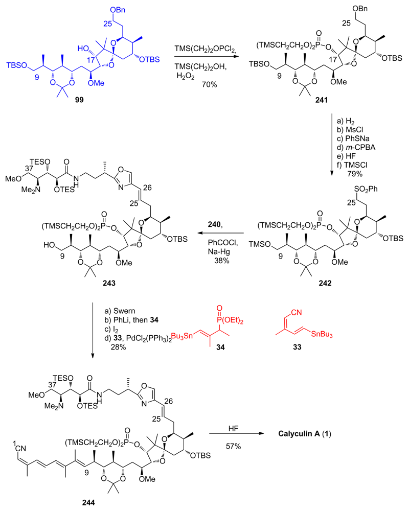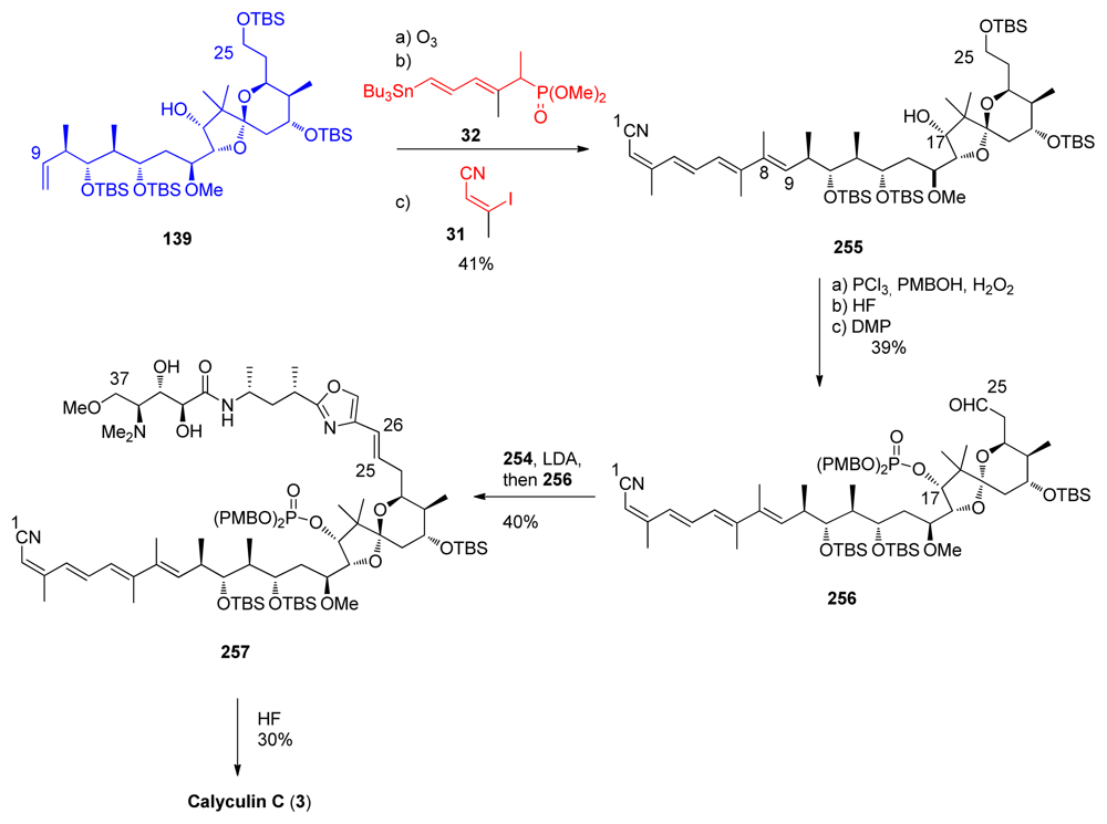 The final stages of the synthesis followed Evans’ example (Scheme 56). Fragment 139 was converted to the tetraene 255. C17-phosphonate protection, C25-deprotection and subsequent oxidation furnished aldehyde 256. Olefination between 256 and 254 furnished compound 257 in modest yield. Final HF treatment completed the total synthesis of calyculin C 3.