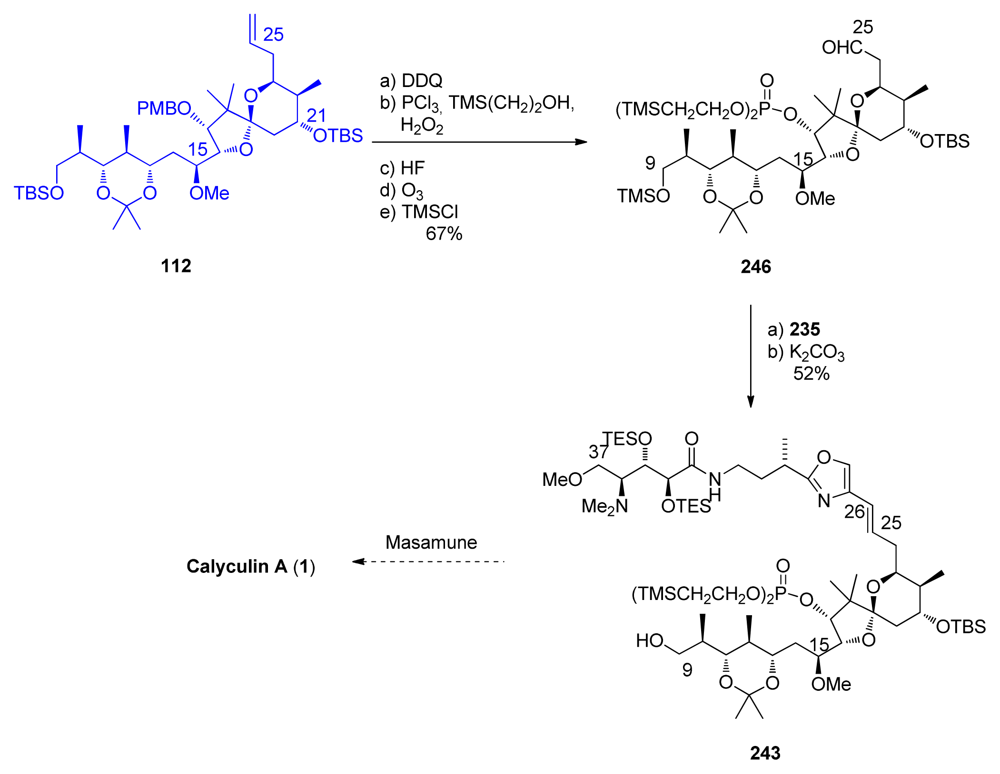 Each of these syntheses resulted from extensive efforts and has to be considered as high level work. As discussed earlier, the structure of calyculins makes the total synthesis very demanding in every aspect; every fragment had its own features and presented challenges. Of course, theses syntheses are not perfect and some drawbacks could be noted, like a C13-stereochemistry inversion for Evans, a low-yielding iodide-tin exchange for Masamune, protecting groups exchange for Shioiri, low selectivity in the final Peterson olefination for Smith (which fortunately led to the formation of ent-calyculin B), stereochemistry inversions and poor selectivity in the second Brown crotylation for Armstrong or a C15-stereochemistry inversion for Barrett. However, all these syntheses were performed before 2000 and all the new tools that have appeared in the last decade for stereoselective transformations were not available. For all these reasons, these total syntheses of the structurally much elaborated calyculins deserve the biggest respect from the synthetic community.