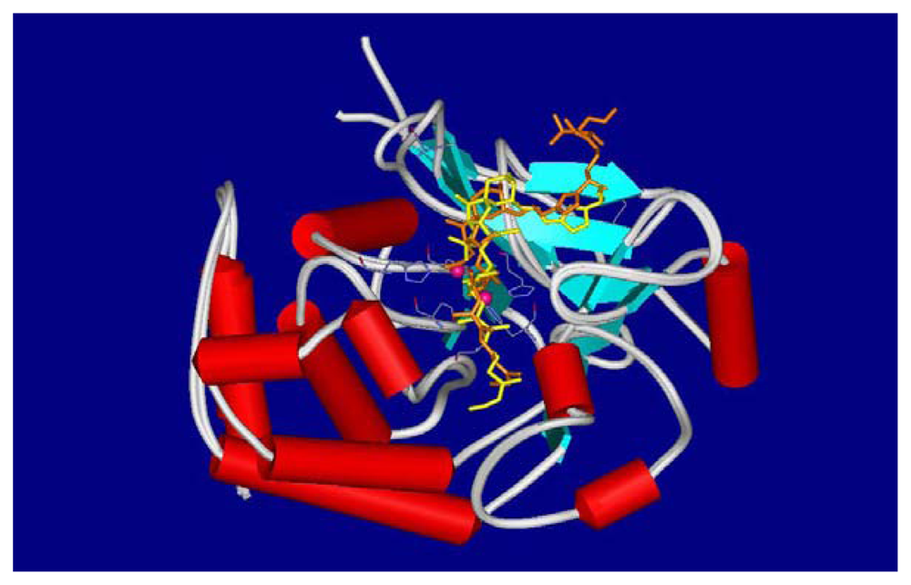 Calyculins as well as other inhibitors have been targets of continuous study and several binding models have been proposed [28,35–37]. The binding mode of calyculin A (1) to the active site of PP1 is shown in Figure 6: 1 is represented according to its crystal structure in orange [35], in yellow is the calyculin model built by Koskinen [34].
