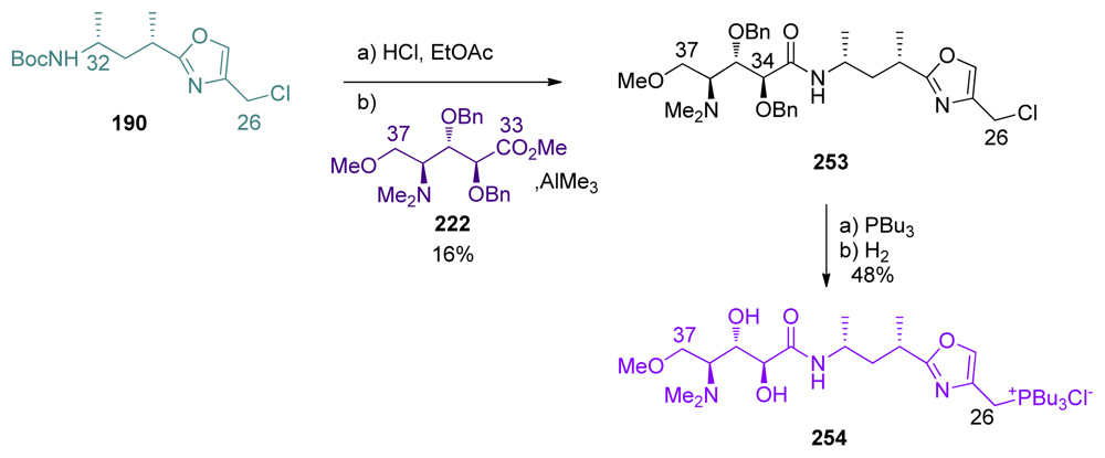 The total synthesis of calyculin C by Armstrong was also a result of perseverant work. Armstrong and co-workers were also the first to prepare calyculin C and prove its stereochemistry. Boc-deprotection of 190 was followed by coupling with ester 222 (Scheme 55). Unfortunately, this reaction produced a 2.7:1 mixture of C34 epimers. Further studies proved that the main product was the undesired isomer; the expected diastereomer 253 being isolated in only 17%. Conversion of the chloride to the phosphonium salt and benzyl-deprotection then furnished 254.