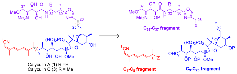 Calyculins, highly cytotoxic polyketides, originally isolated from the marine sponge Discodermia calyx by Fusetani and co-workers, belong to the lithistid sponges group. These molecules have become interesting targets for cell biologists and synthetic organic chemists. The serine/threonine protein phosphatases play an essential role in the cellular signalling, metabolism, and cell cycle control. Calyculins express potent protein phosphatase 1 and 2A inhibitory activity, and have therefore become valuable tools for cellular biologists studying intracellular processes and their control by reversible phosphorylation. Calyculins might also play an important role in the development of several diseases such as cancer, neurodegenerative diseases, and type 2-diabetes mellitus. The fascinating structures of calyculins have inspired various groups of synthetic organic chemists to develop total syntheses of the most abundant calyculins A and C. However, with fifteen chiral centres, a cyano-capped tetraene unit, a phosphate-bearing spiroketal, an anti, anti, anti dipropionate segment, an α-chiral oxazole, and a trihydroxylated γ-amino acid, calyculins reach versatility that only few natural products can surpass, and truly challenge modern chemists’ asymmetric synthesis skills.