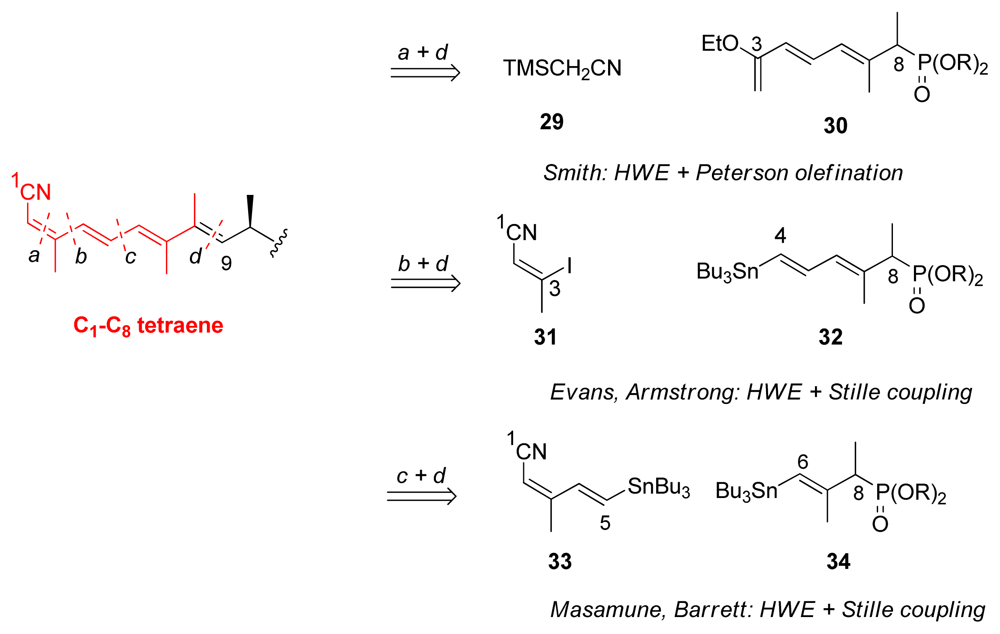 Based on the disconnections of the building blocks, the retrosynthetic analysis of tetraene can be divided into three groups (Scheme 3). Smith’s group choose to disconnect in position a and d which gives nitrile 29 and phosphate 30 [22], whereas Evans’ and Armstrong’s target was to create vinyl iodide 31 and phosphate 32, via b and d disconnections [18,21]. Finally, Masamune and Barrett chose c and d disconnections involving intermediates 33 and 34 [19,23].