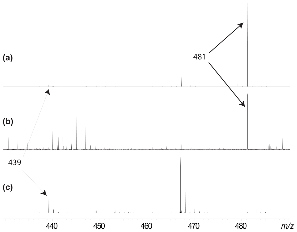 Portion of the molecular ion spectrum of: (a) Frozen, lyophilised sponge containing manoalide monoacetate (3, m/z 481) and trace amounts of manoalide (1, m/z 439), (b) frozen, lyophilised bulk larvae containing 3 only, and (c) thawed bulk larvae showing the presence of 1 and a total loss of 3.