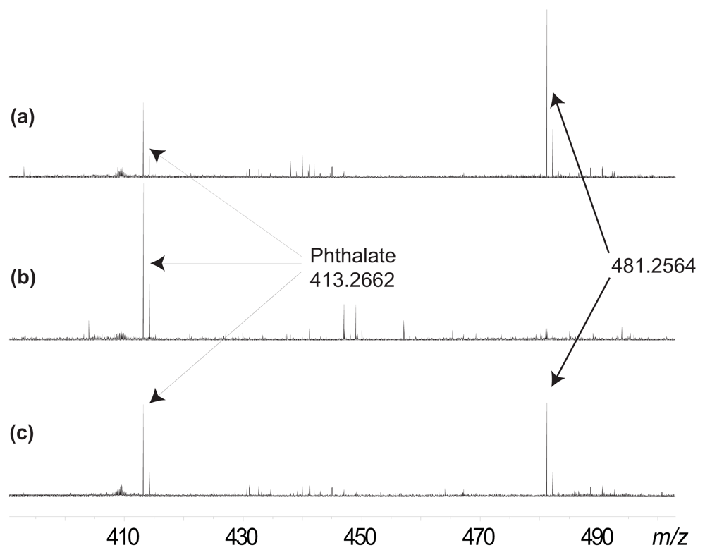 Repeating the analysis with a single larva resulted in the detection of an ion at m/z 481.2564, again within 1 ppm of expected 481.2561 for C27H38O6Na+, corresponding to 3. To ensure there was no carry over between injections the syringe and spray needle were flushed three times with neat methanol (MeOH, Omnisolv HPLC grade) and then data acquired on a DCM-MeOH (1:1) blank between each sample. A second, repeated injection of the DCM extract from a single larva confirmed the presence of the peak at m/z 481. The presence of a persistent dioctyl phthalate ion at m/z 413.2662 [C24H38O4Na+], a plasticizer used extensively throughout society and now found throughout the environment, fortuitously provided an internal standard by which the spectra could be normalized for direct comparison (Figure 3). All 10 individual larva analysed were found to contain an ion corresponding to 3, the same as that observed for the frozen sponge itself (Figure 3).